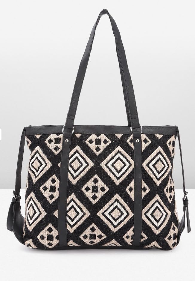 Elevate your style with this chic and versatile handbag. Crafted with a striking geometric pattern in contrasting black and beige hues, it exudes a bohemian flair that effortlessly complements any ensemble. The spacious interior offers ample room for your daily essentials, while the sturdy construction ensures lasting durability. Whether you're heading to the office or exploring the city, this handbag is the perfect accessory to elevate your look with a touch of sophistication. Featuring adjustable shoulder straps for added comfort and convenience, it seamlessly blends fashion and functionality. Embrace the allure of this eye-catching handbag and make a statement wherever you go.
