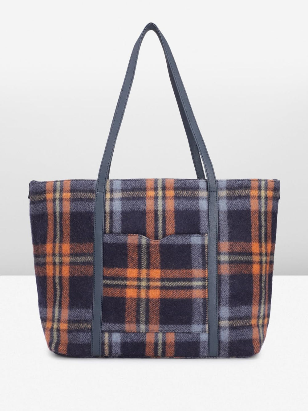 This stylish and versatile tote bag is a must-have accessory for the modern woman on-the-go. Crafted from high-quality wool, it features a striking plaid pattern in hues of orange, black, and grey, lending a touch of sophistication to any ensemble. The spacious interior provides ample room for all your daily essentials, while the sturdy leather handles ensure a comfortable and secure grip. Whether you're heading to the office, running errands, or embarking on a weekend getaway, this tote bag effortlessly combines fashion and functionality. Its timeless design and durable construction make it a practical investment that will complement your wardrobe for seasons to come. Embrace the perfect blend of style and practicality with this chic and capacious tote bag.