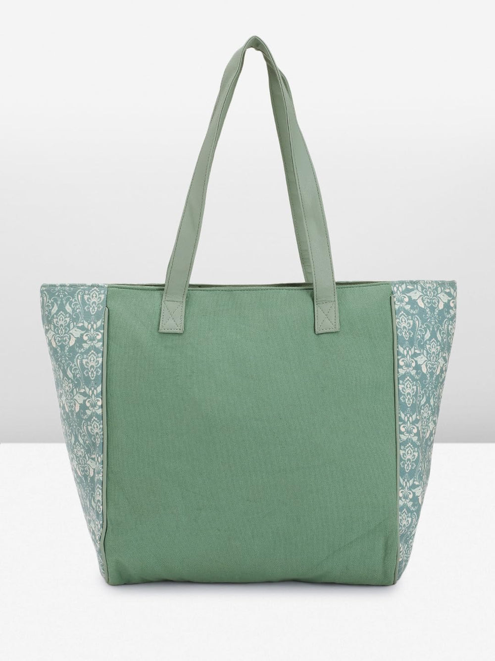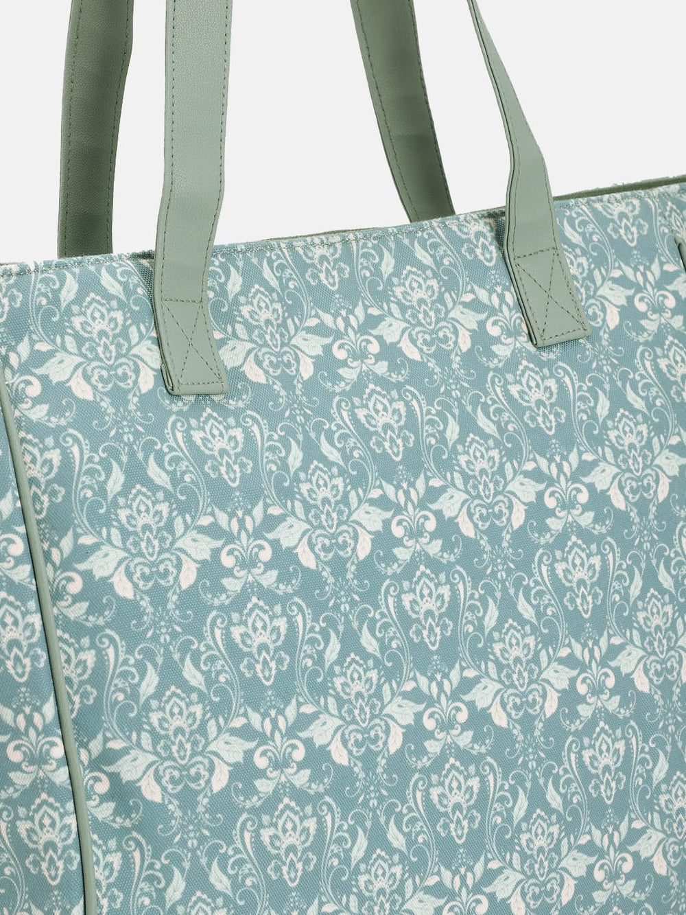 This stylish tote bag for women boasts an elegant teal hue adorned with intricate damask patterns in a lighter shade. The spacious interior and sturdy construction make it perfect for carrying your daily essentials with ease. The contrasting olive green straps provide a chic contrast, while the classic design ensures versatility to complement any outfit. Crafted with meticulous attention to detail, this tote bag is both fashionable and functional, allowing you to carry your belongings in style wherever you go.