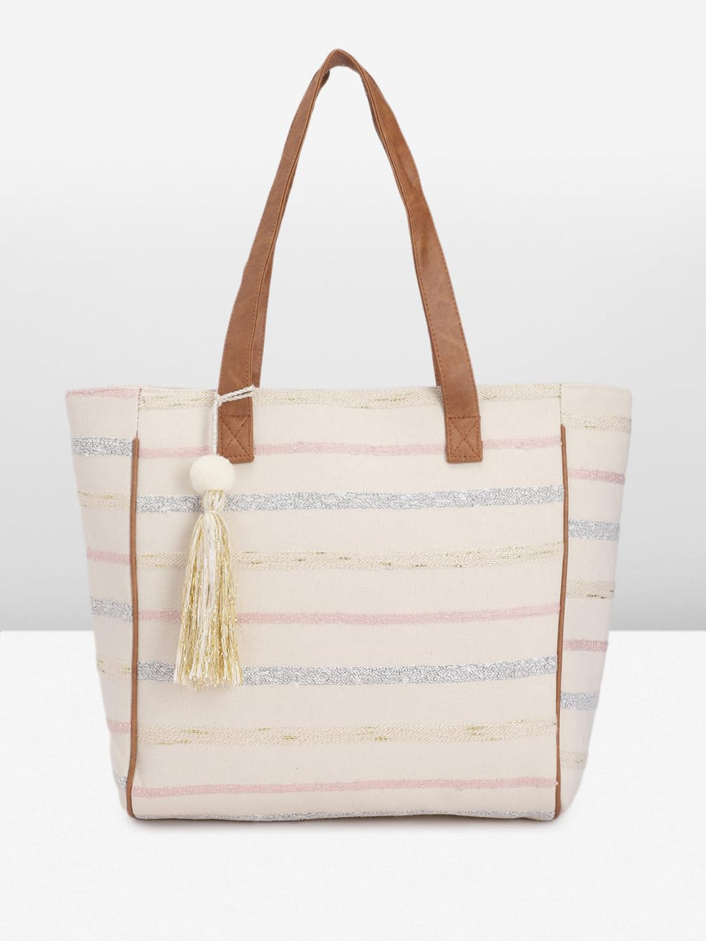 Elevate your style with this chic and versatile hand bag for women. Crafted from premium materials, it features a striped pattern in soft hues of cream, pink, and grey, lending a touch of sophistication to your ensemble. The spacious interior offers ample room for your daily essentials, while the sturdy leather handles provide a comfortable grip. Accentuated with a playful tassel detail, this tote effortlessly combines fashion and functionality. Whether you're heading to the office or enjoying a day out, this hand bag will be your stylish companion, complementing your outfits with its timeless charm. Embrace the perfect blend of elegance and practicality with this must-have accessory.