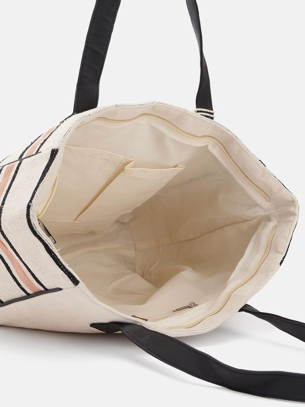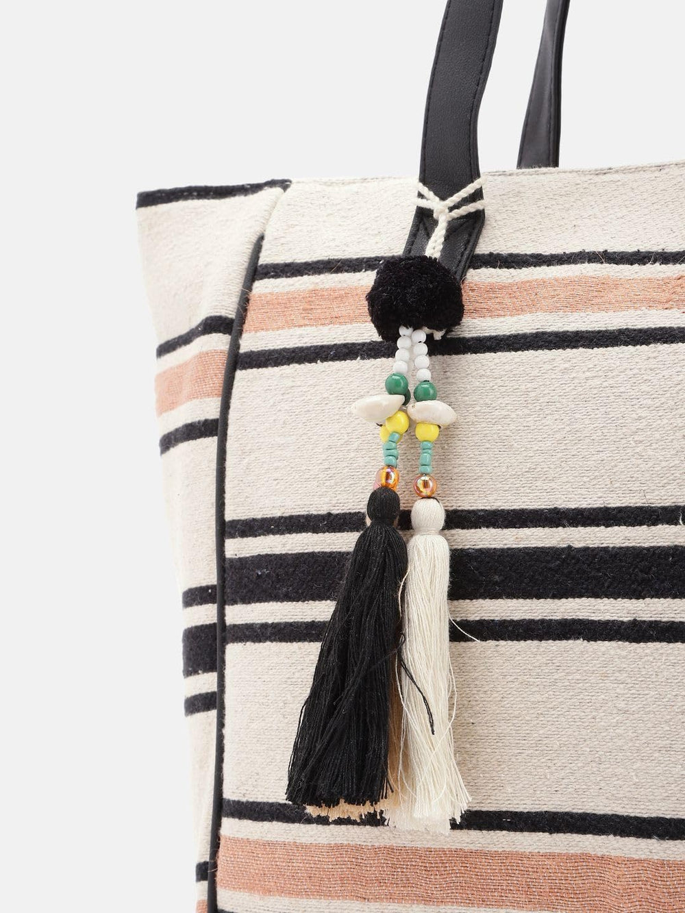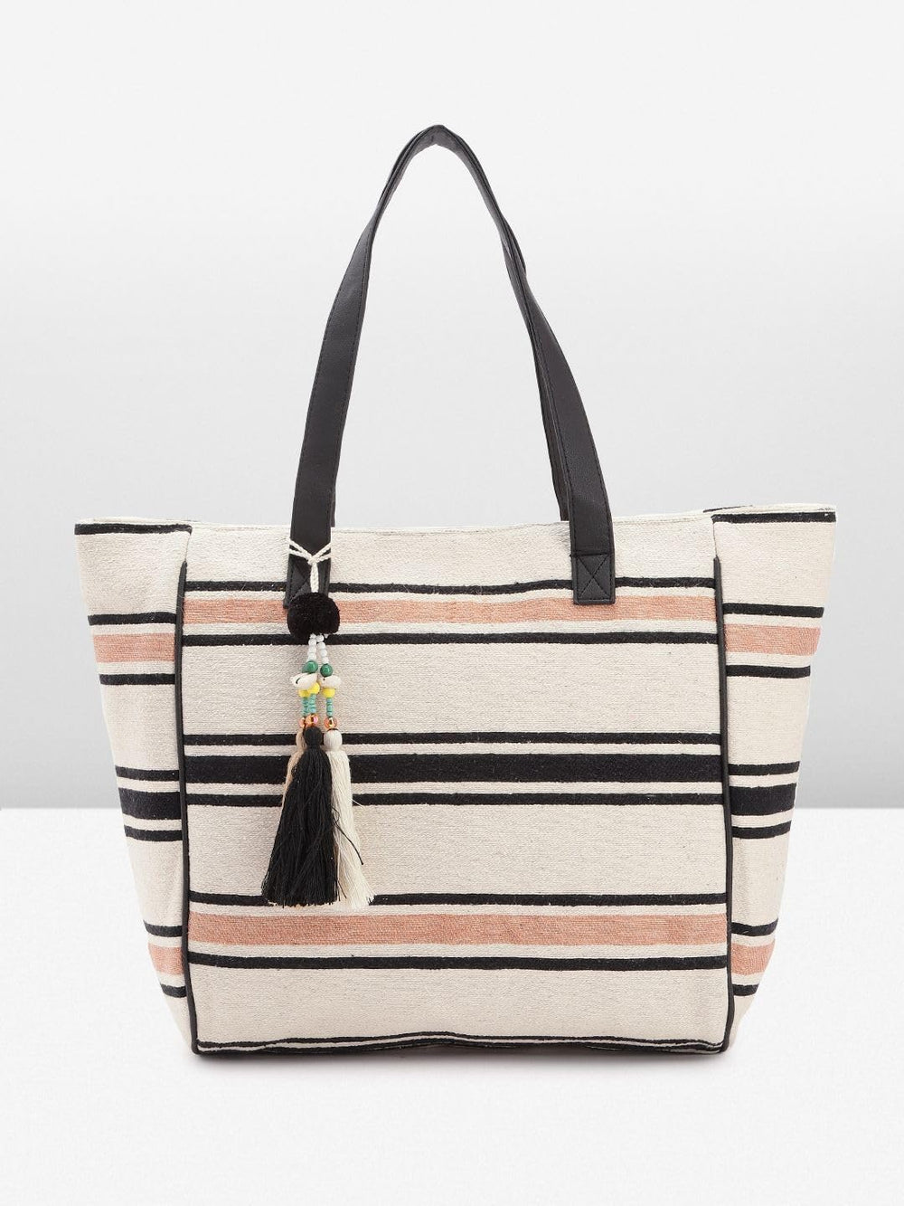 Elevate your style with this chic and versatile striped tote bag. Crafted from a durable canvas material, it features a striking pattern of black, white, and peach stripes that exude effortless sophistication. The spacious interior offers ample room for all your daily essentials, while the sleek leather handles provide a comfortable grip. Accentuated with a playful tassel charm, this bag seamlessly blends fashion and functionality. Whether you're running errands or heading to the office, this stylish tote will be your go-to companion. Dimensions: 35 cm x 32 cm x 15 cm.