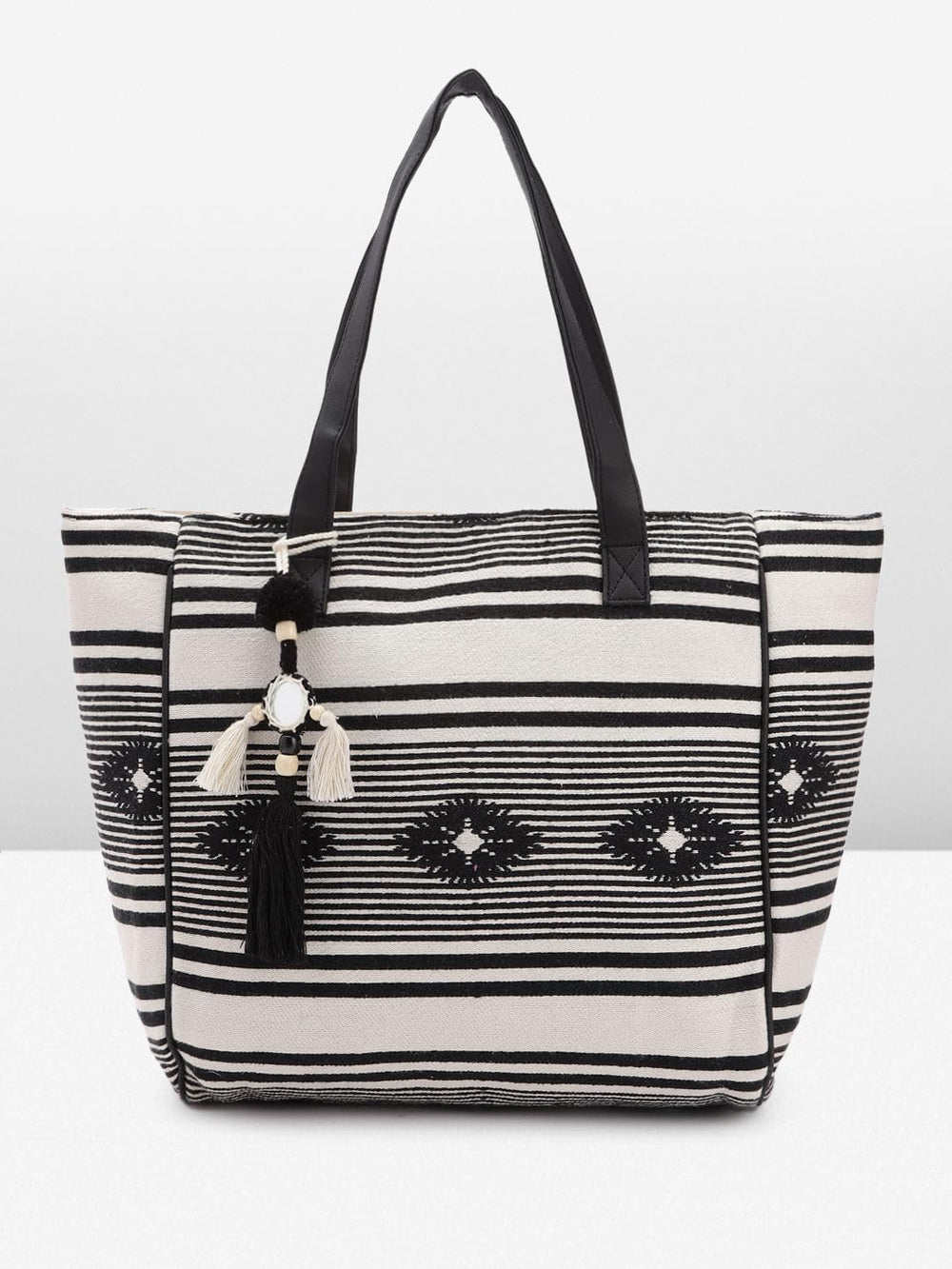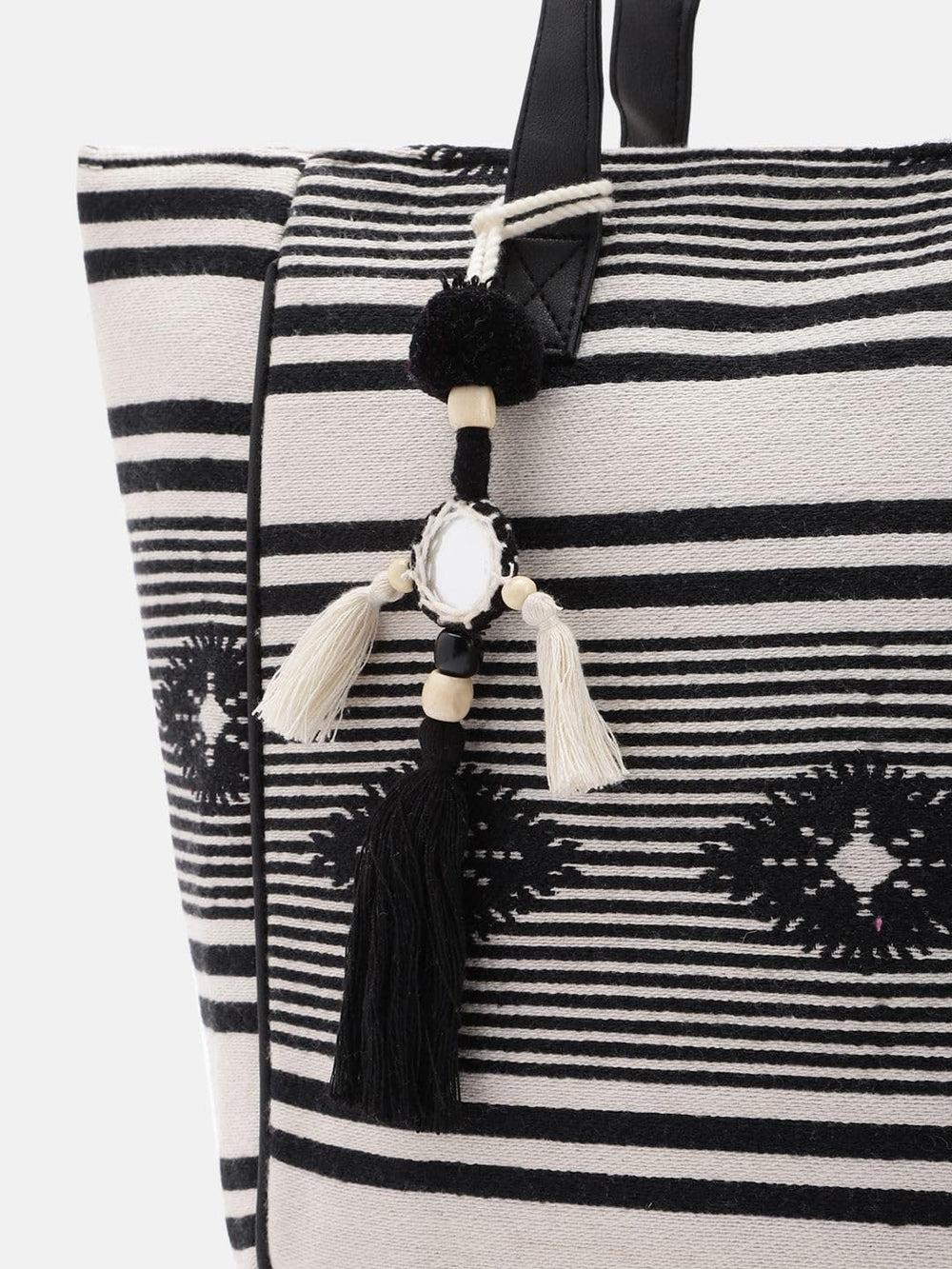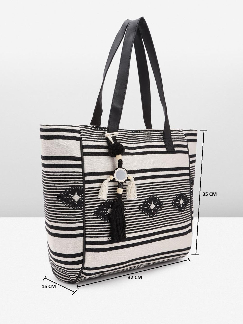 Elevate your style with this chic and trendy tote bag. The striking black and white striped pattern, accented by intricate lace detailing, exudes a bohemian flair. Crafted from high-quality materials, this spacious bag offers ample room for all your essentials. The adjustable shoulder straps ensure a comfortable carrying experience, while the tassel embellishments add a touch of playful charm. Whether you're running errands or enjoying a day out, this tote bag is the perfect accessory to complement your fashionable ensemble. Lightweight yet durable, it's an ideal companion for the modern, on-the-go woman.
