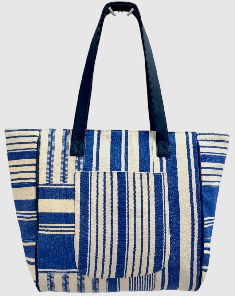 . Stylish Patchwork Design: Features a unique blue and cream striped patchwork pattern that combines various stripe orientations for a distinctive nautical-inspired aesthetic