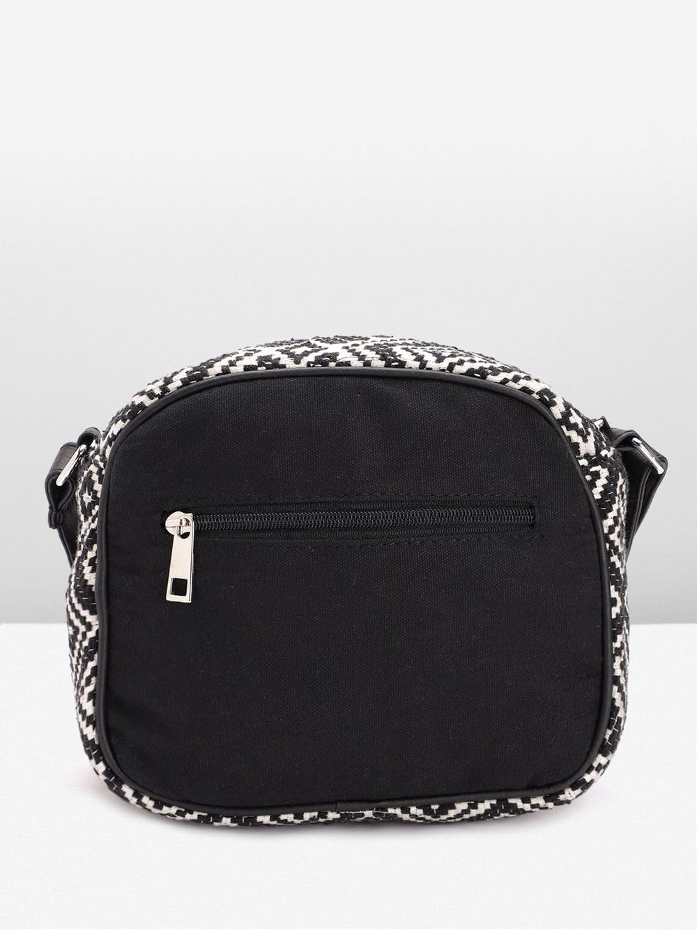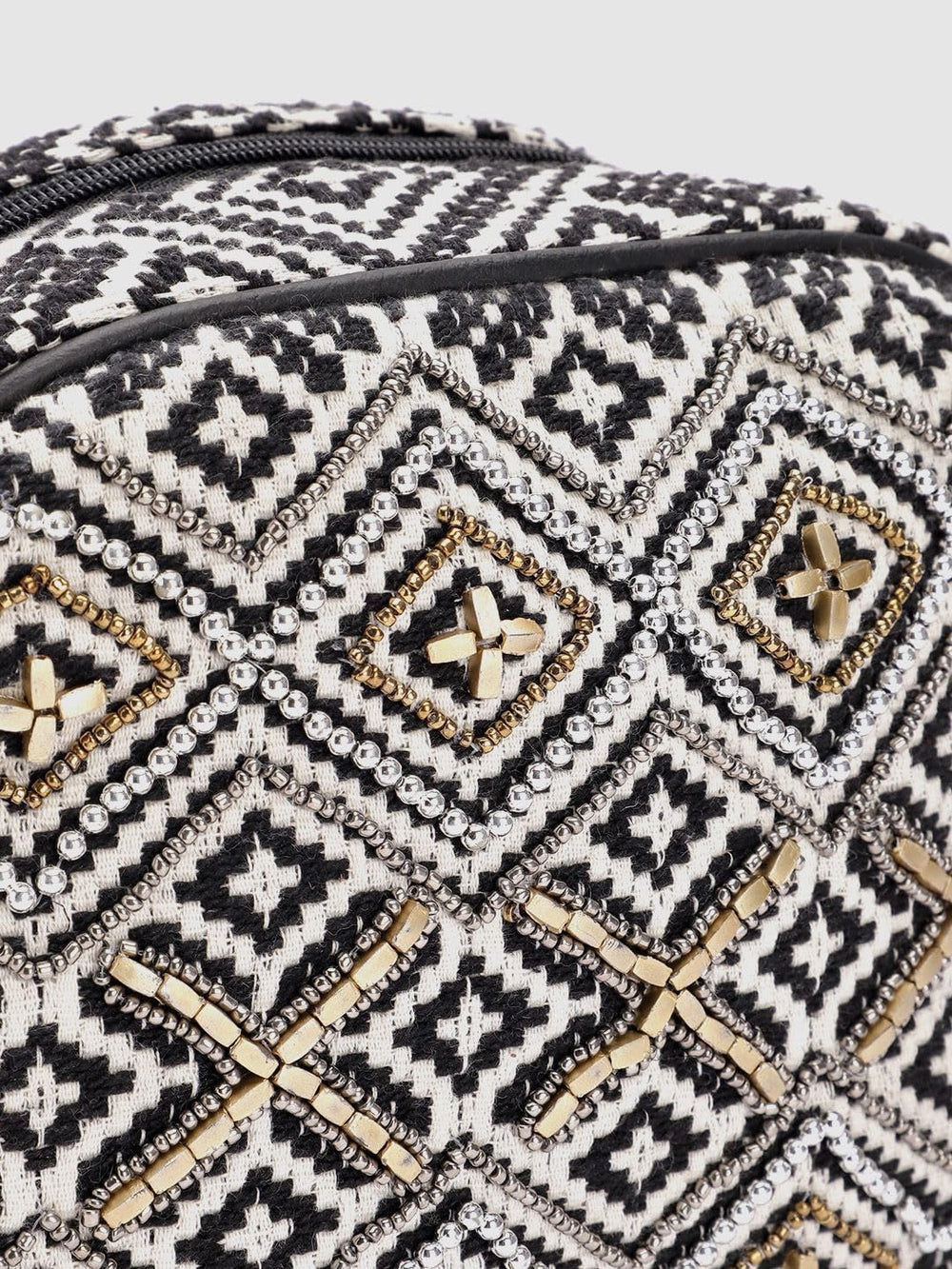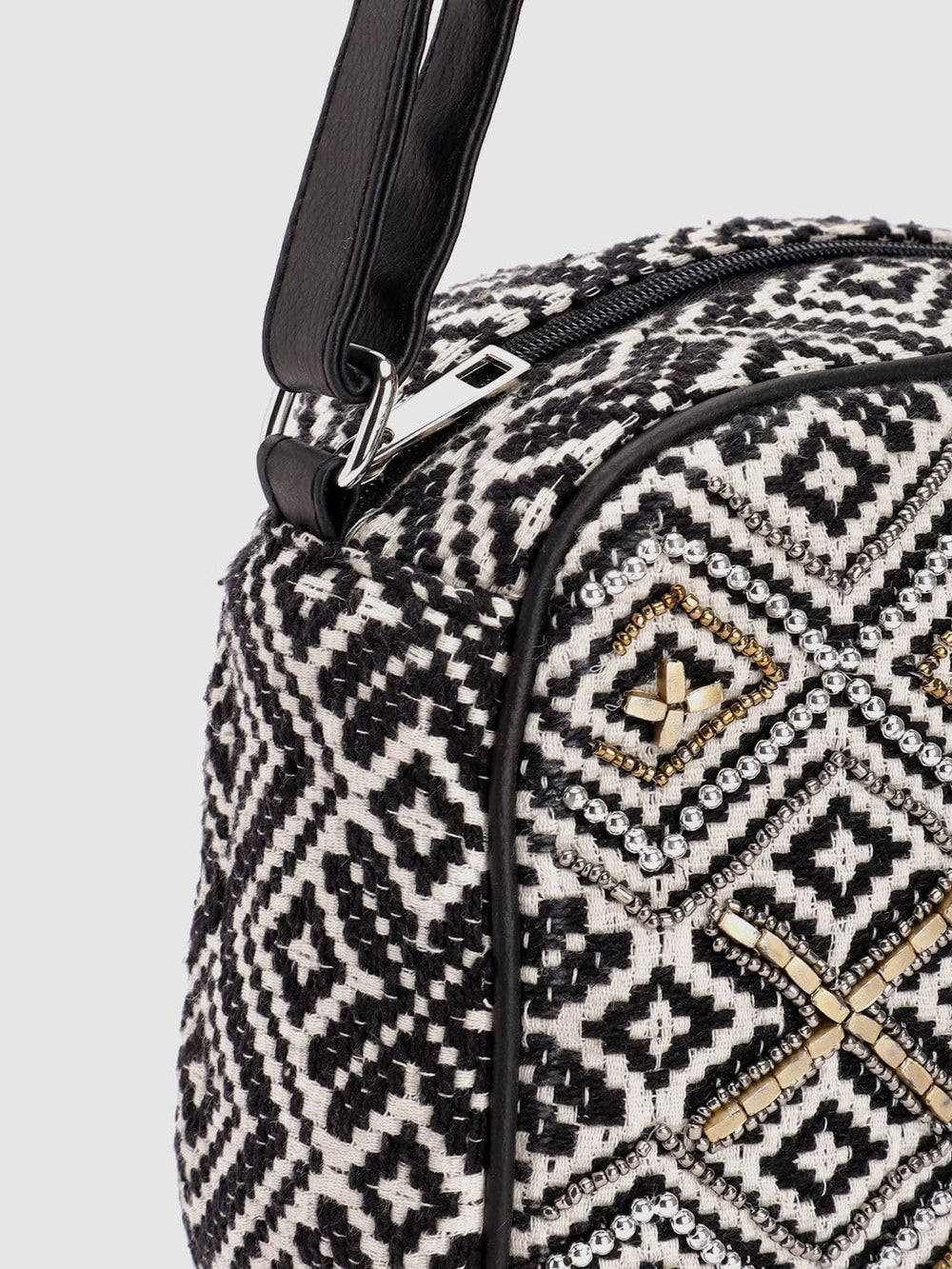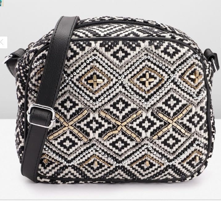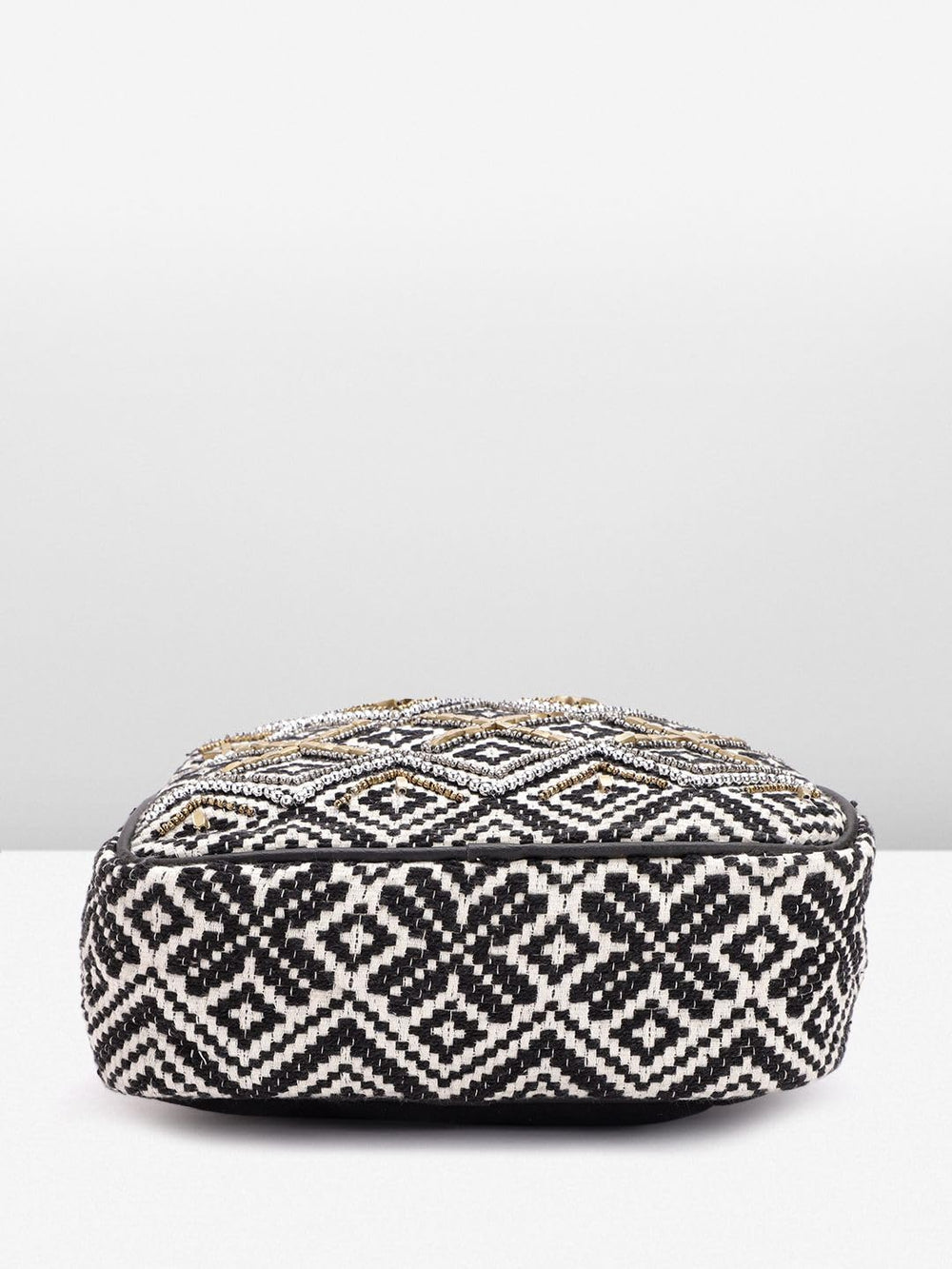 Elevate your style with this chic and trendy handbag for women. Crafted with intricate geometric patterns in monochrome hues, this crossbody bag exudes a bohemian vibe. The spacious interior compartment allows you to carry your essentials with ease, while the adjustable shoulder strap ensures a comfortable fit. Featuring a secure zip closure and durable construction, this bag is both fashionable and functional. Whether you're running errands or attending a casual gathering, this versatile accessory will complement your outfit effortlessly. Embrace the timeless appeal of ethnic motifs with this stylish handbag.
