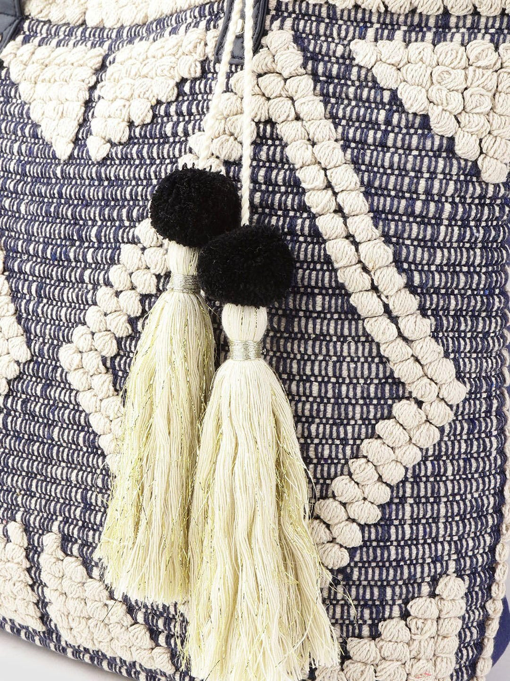 Elevate your style with this exquisite handcrafted tote bag. Woven with intricate patterns in monochrome hues, it exudes an effortless elegance. The spacious interior offers ample room for your daily essentials, while the leather straps provide a comfortable grip. Adorned with tasselled embellishments, this bag adds a touch of bohemian flair to any ensemble. Versatile and chic, it's the perfect accessory for the modern, fashion-conscious woman. Embrace the artisanal craftsmanship and make a statement wherever you go.