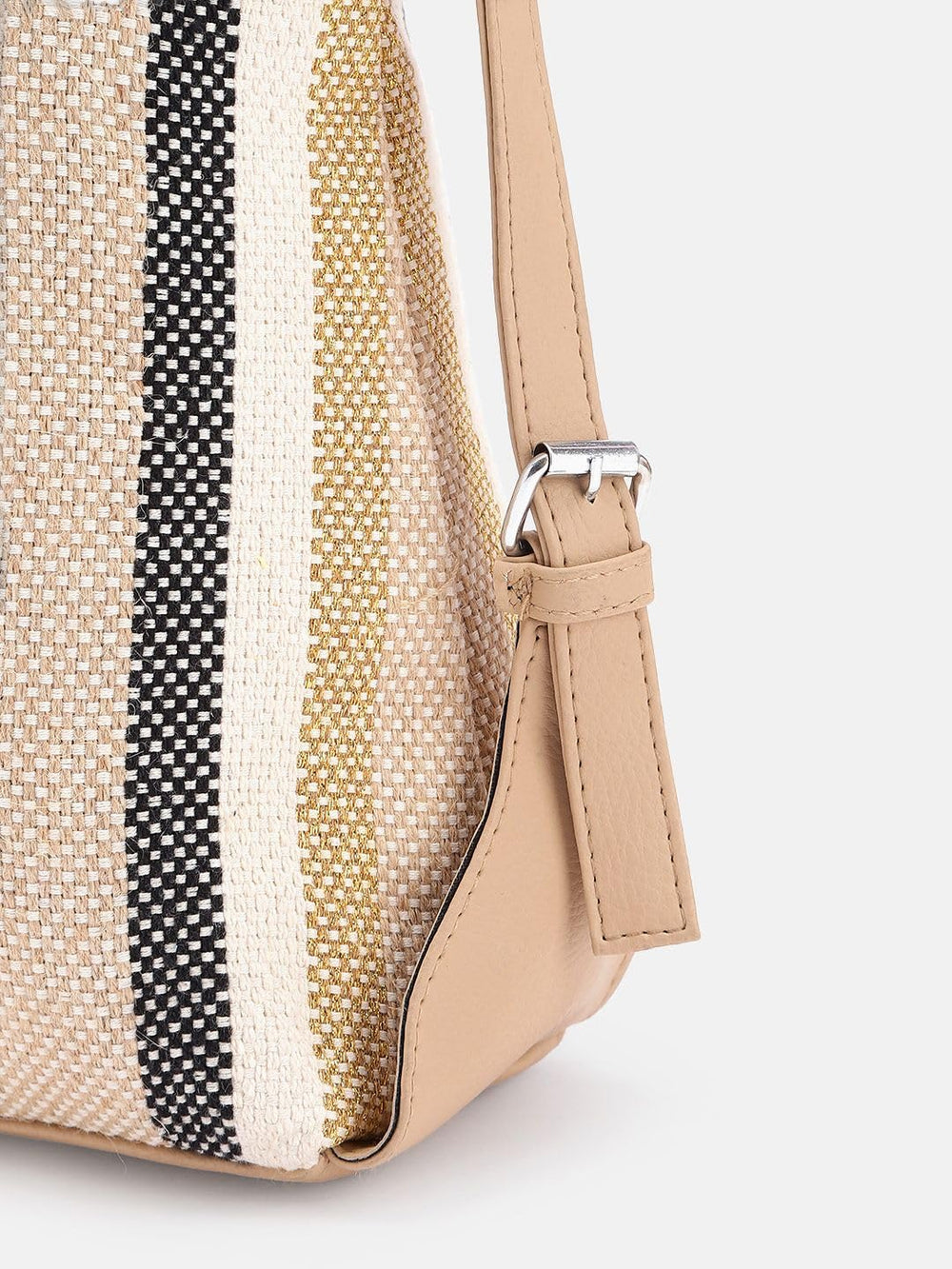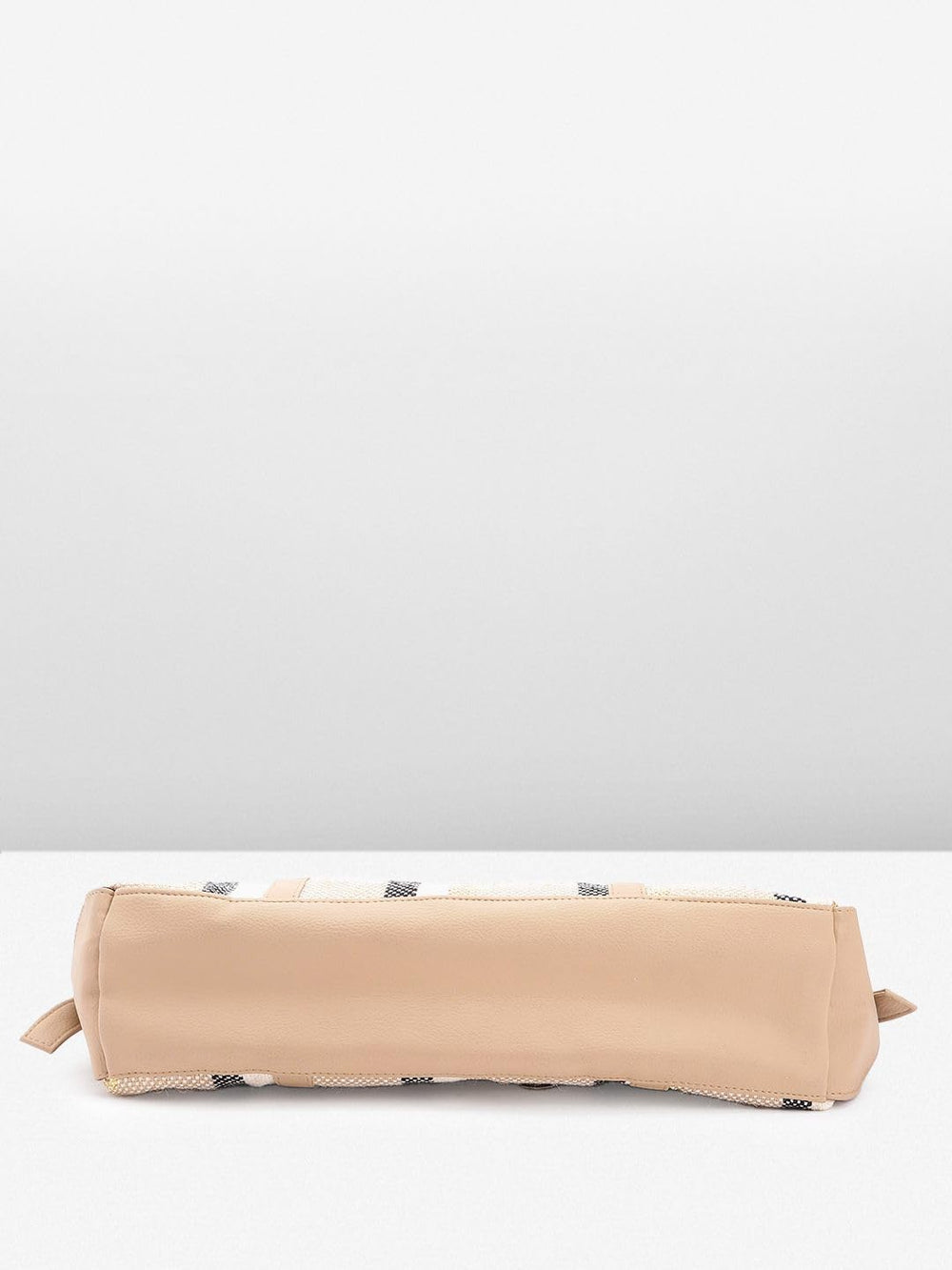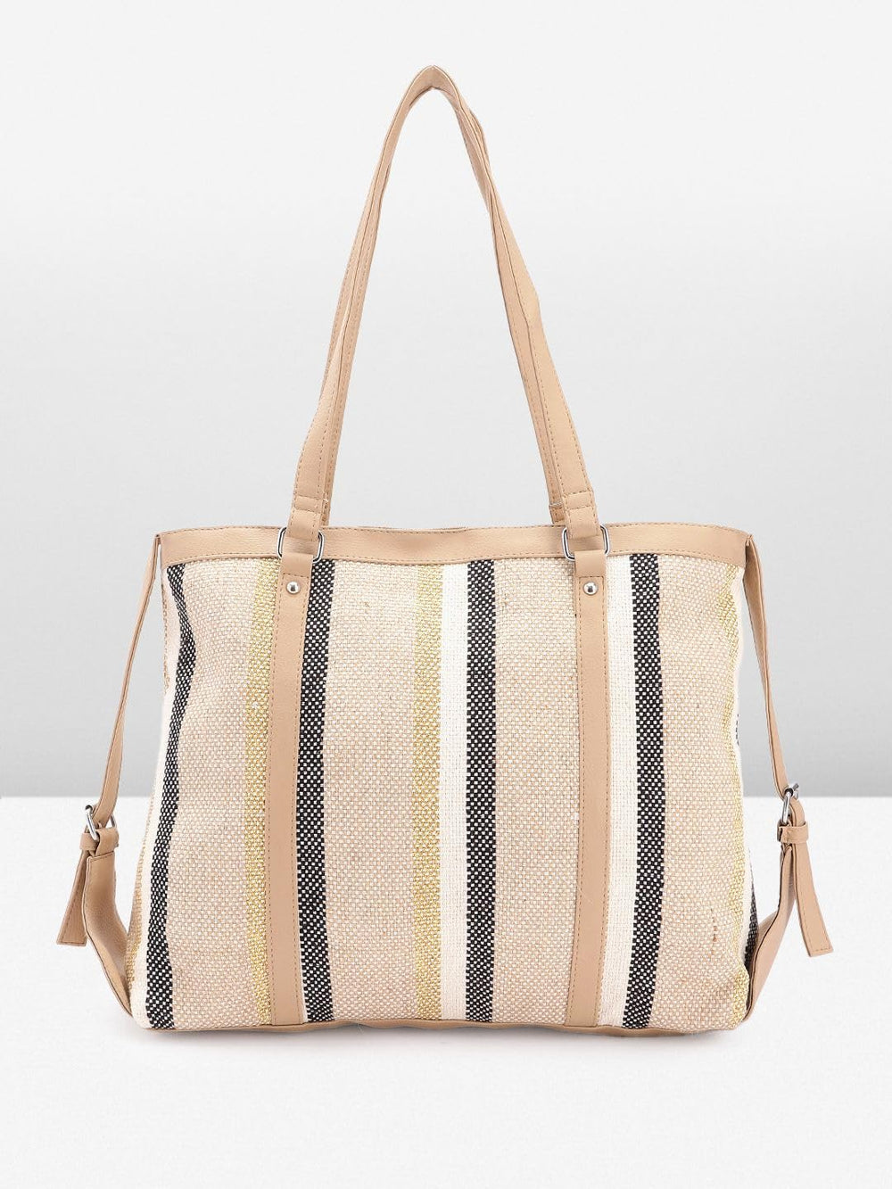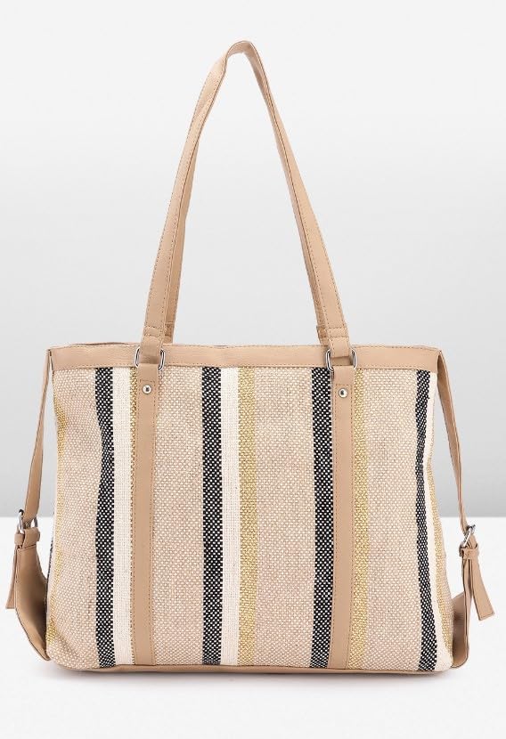 Elevate your style with this chic and versatile hand bag for women. Crafted with meticulous attention to detail, this tote features a woven design with alternating stripes in beige, black, and golden hues, creating a sophisticated and eye-catching pattern. The sturdy construction and spacious interior make it perfect for carrying your daily essentials, whether you're heading to the office or running errands around town. The dual handles provide a comfortable grip, while the tassel accents add a touch of playful elegance. Measuring 37 cm in length, 31 cm in height, and 9 cm in depth, this bag offers ample space to accommodate your belongings with ease. Embrace timeless fashion and functionality with this stylish hand bag.