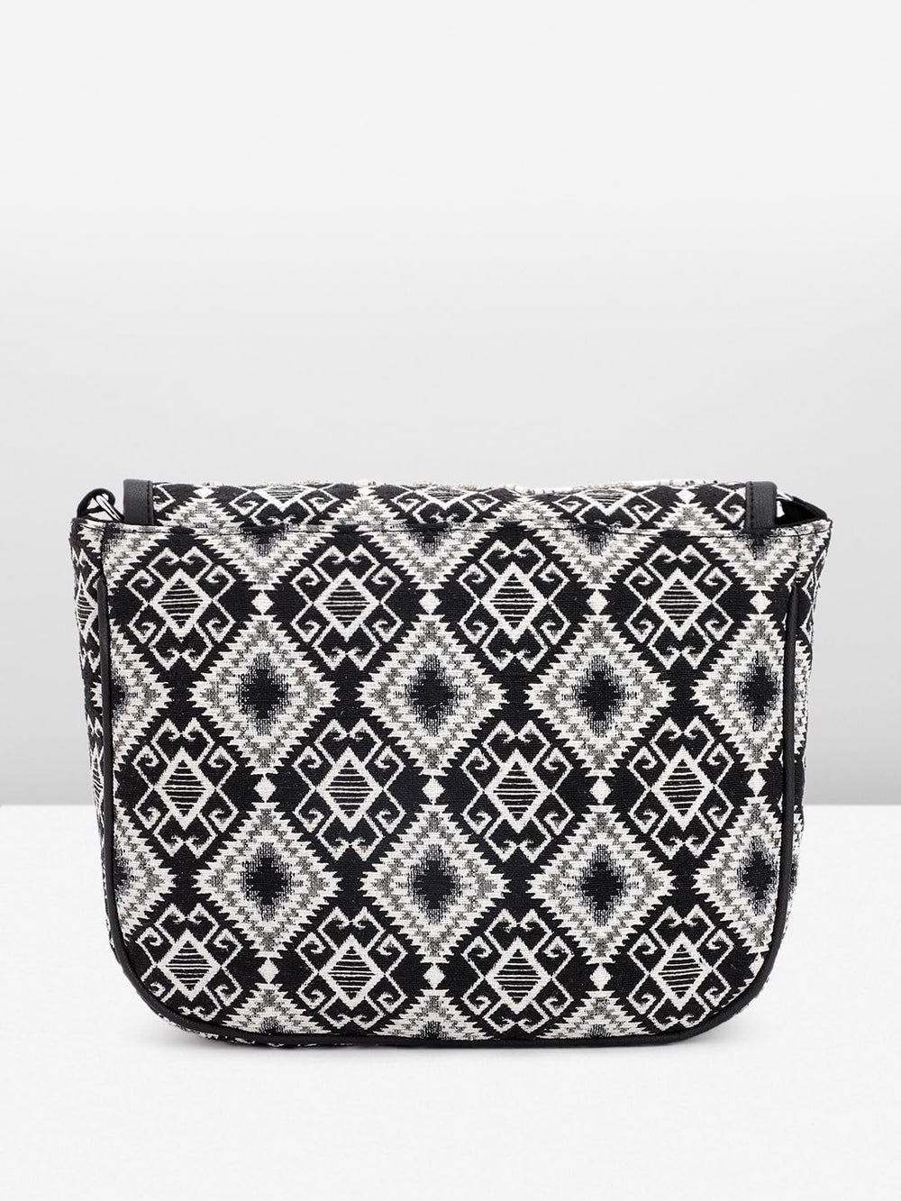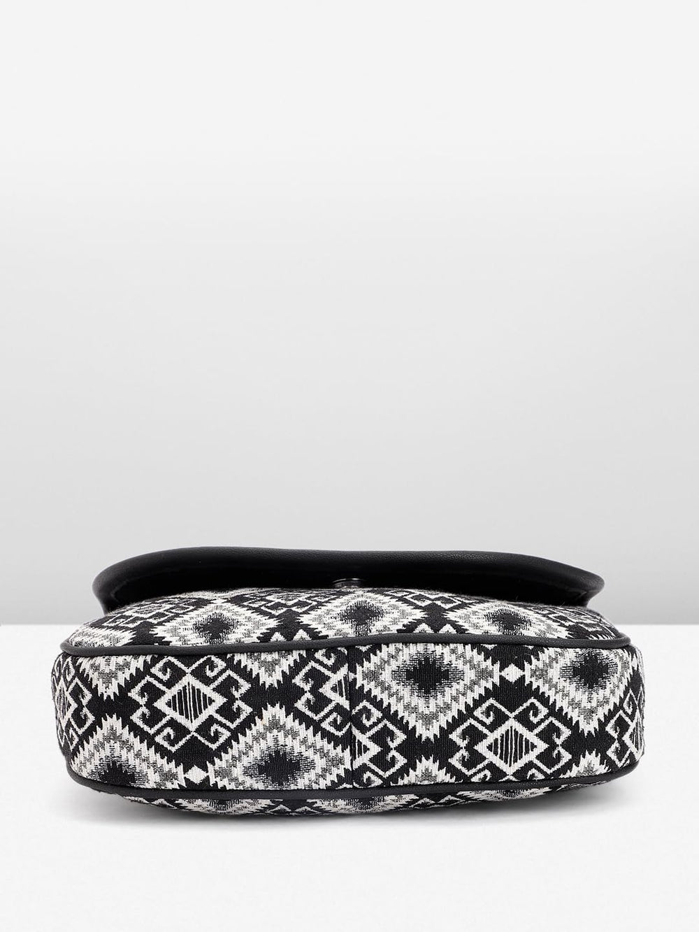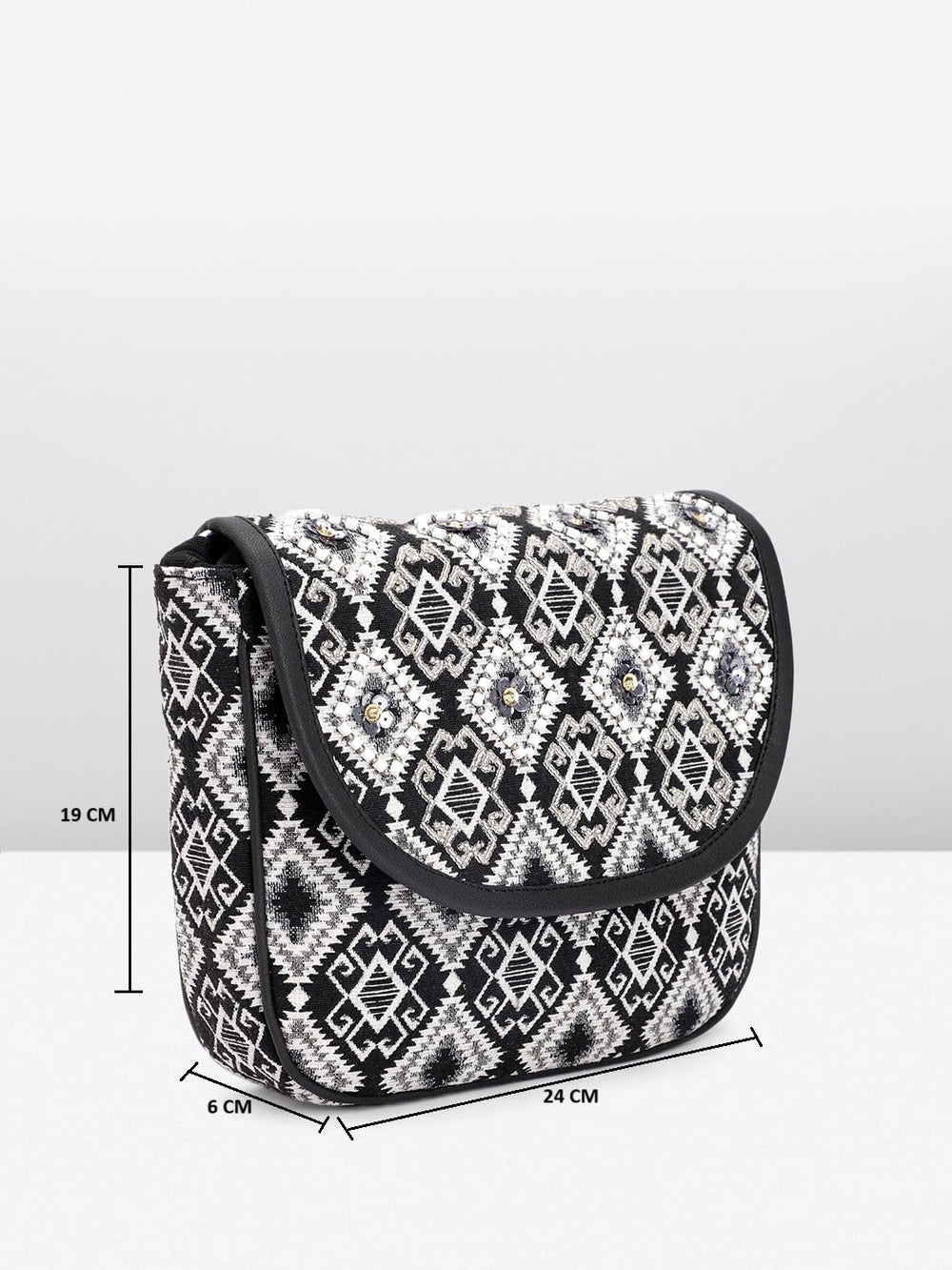Elevate your style with this chic and versatile handbag featuring a striking black and white geometric pattern. Crafted with attention to detail, this crossbody bag boasts a spacious interior and adjustable strap for effortless carrying. Its eye-catching design seamlessly blends traditional motifs with contemporary flair, making it a standout accessory for any ensemble. Embrace sophistication and convenience with this meticulously crafted handbag, perfect for everyday use or special occasions.