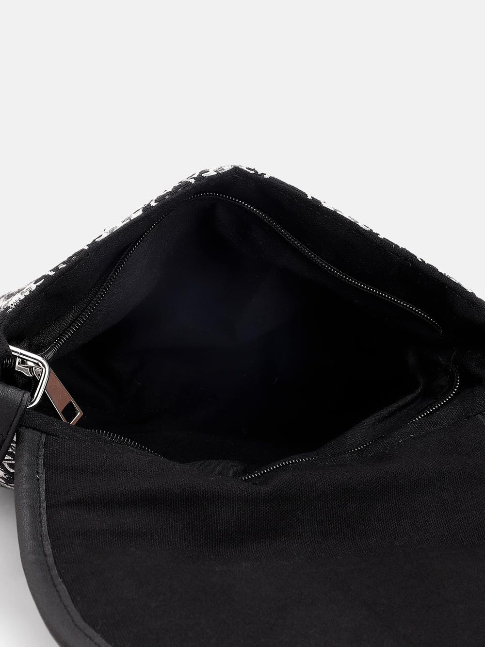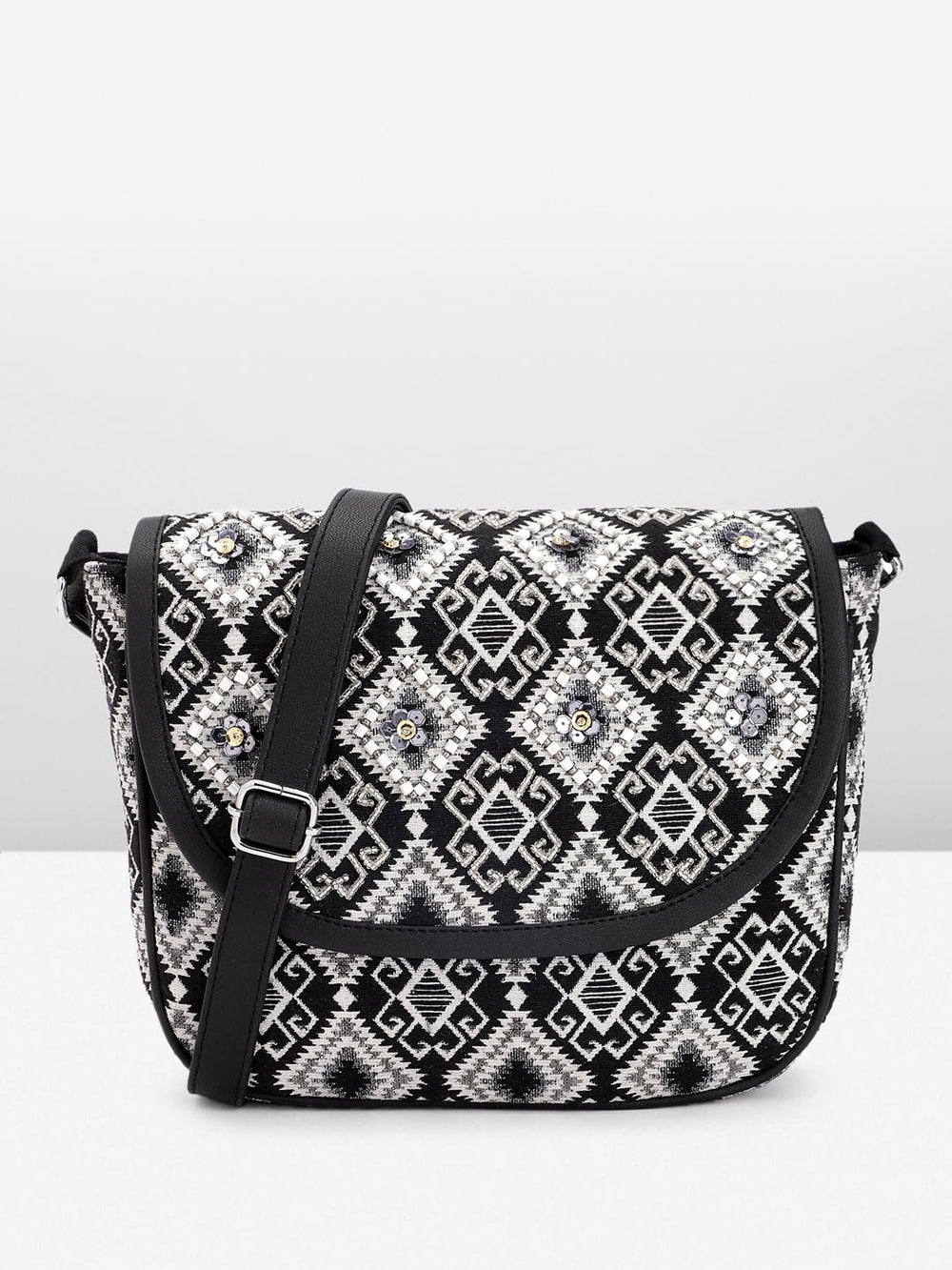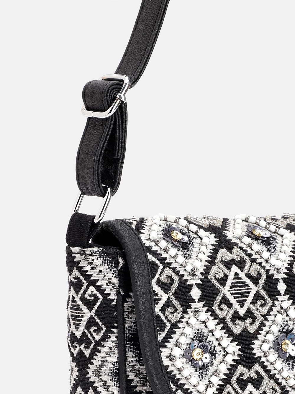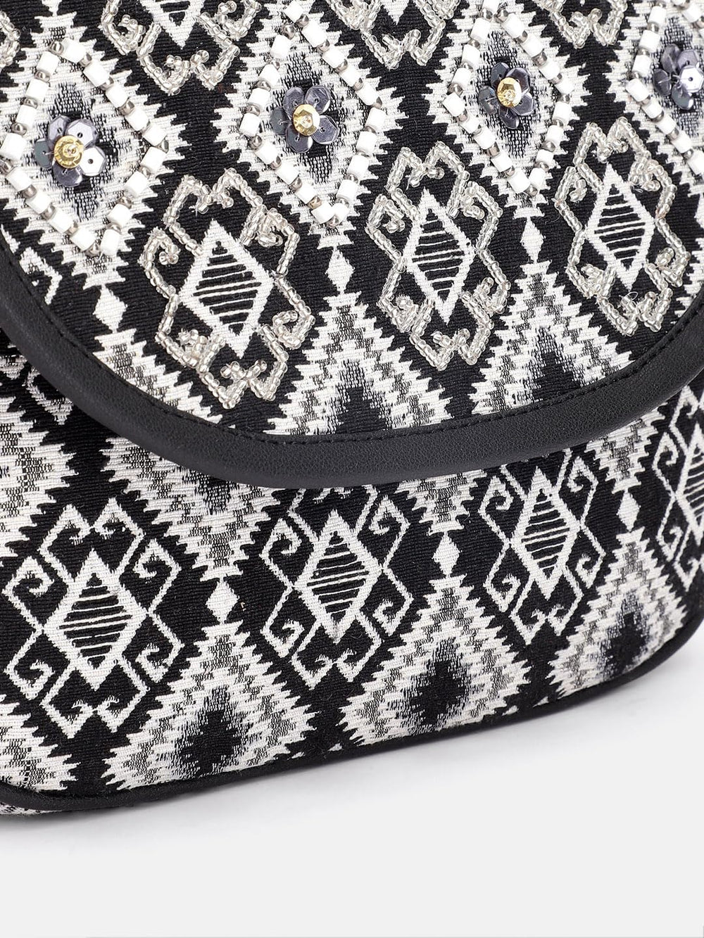 Elevate your style with this chic and versatile handbag featuring a striking black and white geometric pattern. Crafted with attention to detail, this crossbody bag boasts a spacious interior and adjustable strap for effortless carrying. Its eye-catching design seamlessly blends traditional motifs with contemporary flair, making it a standout accessory for any ensemble. Embrace sophistication and convenience with this meticulously crafted handbag, perfect for everyday use or special occasions.