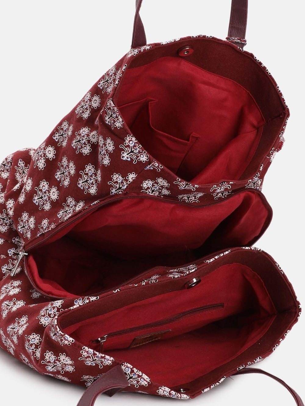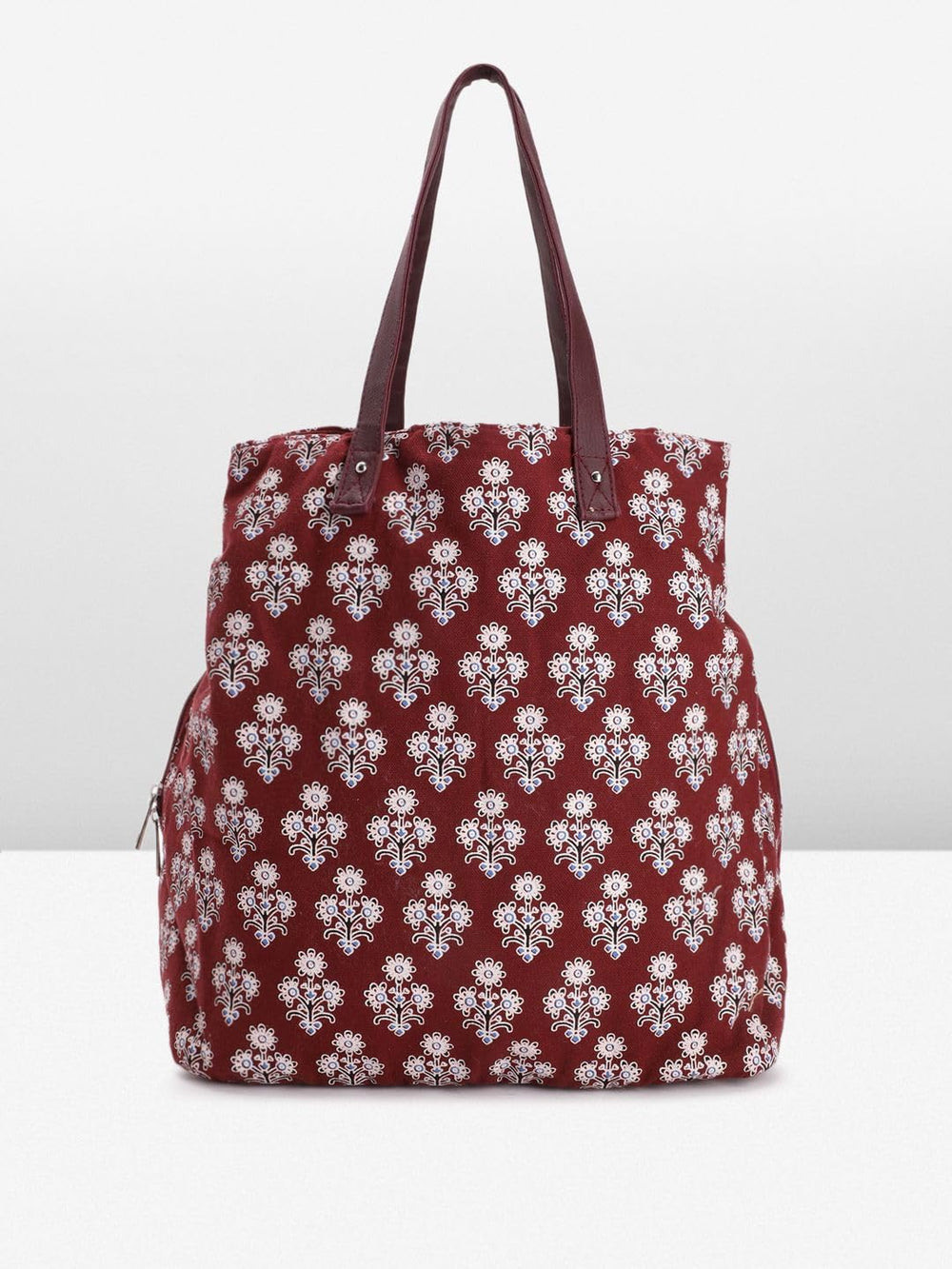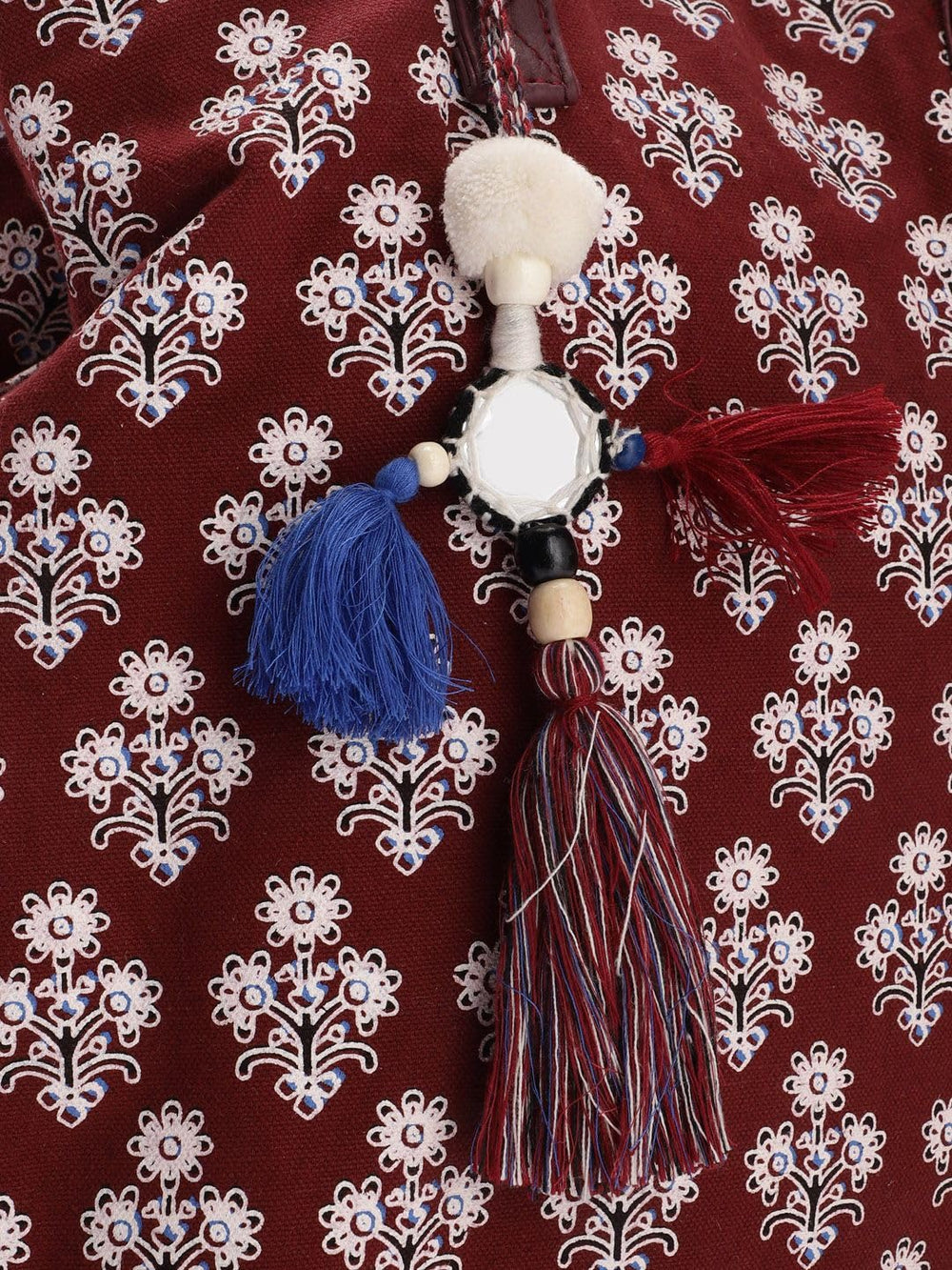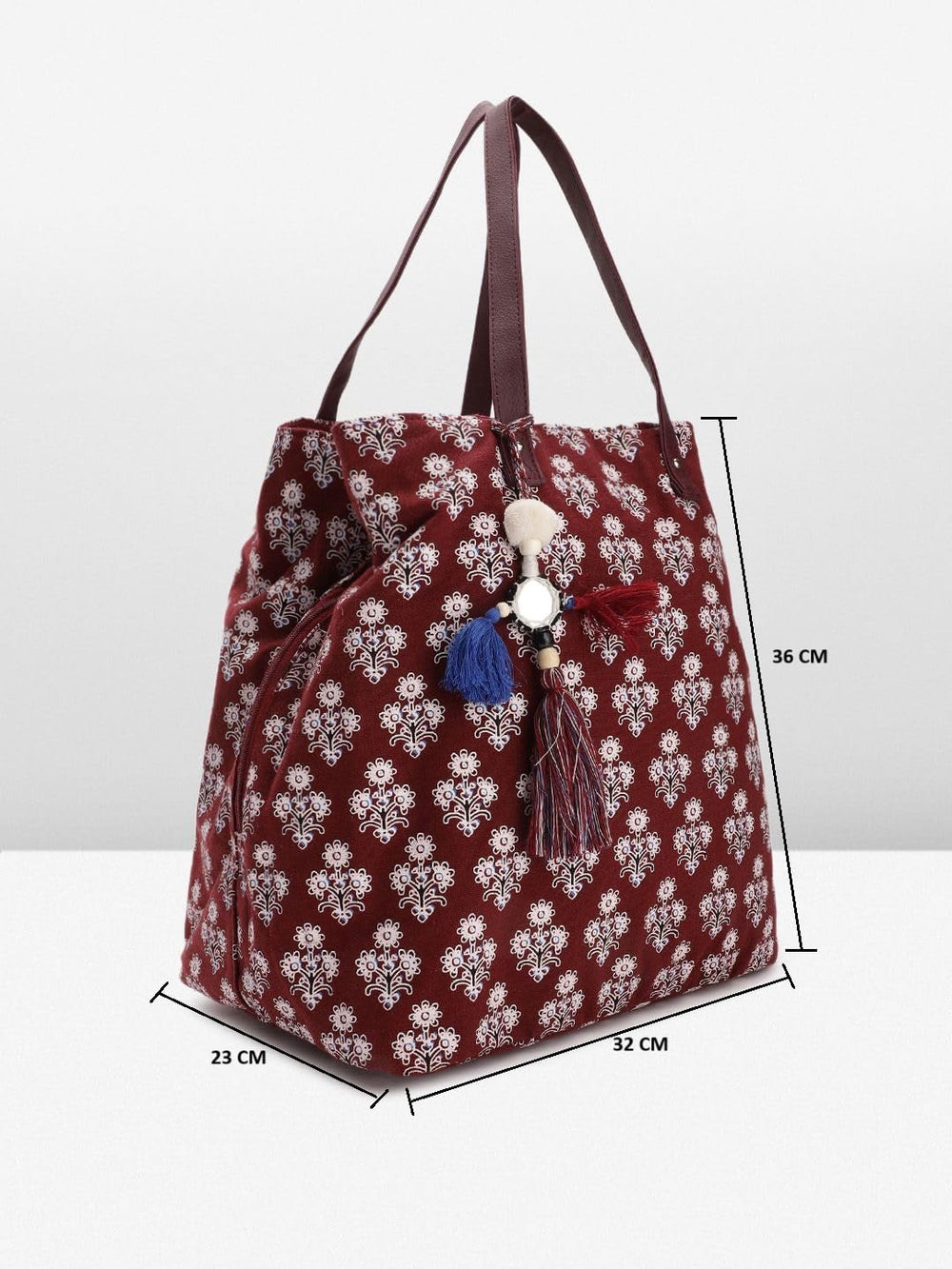Elevate your style with this exquisite handcrafted handbag. Crafted with utmost attention to detail, this tote features a rich burgundy hue adorned with an intricate floral damask pattern in contrasting white. The supple leather construction ensures durability, while the spacious interior offers ample room for all your daily essentials. A tassel charm lends a touch of whimsy, making this bag a true statement piece. Designed for the modern woman on-the-go, this handbag seamlessly blends timeless elegance with contemporary flair. Pair it with your favourite ensemble for a chic and sophisticated look. Please note that due to the handcrafted nature, slight variations may occur, adding to its unique charm.