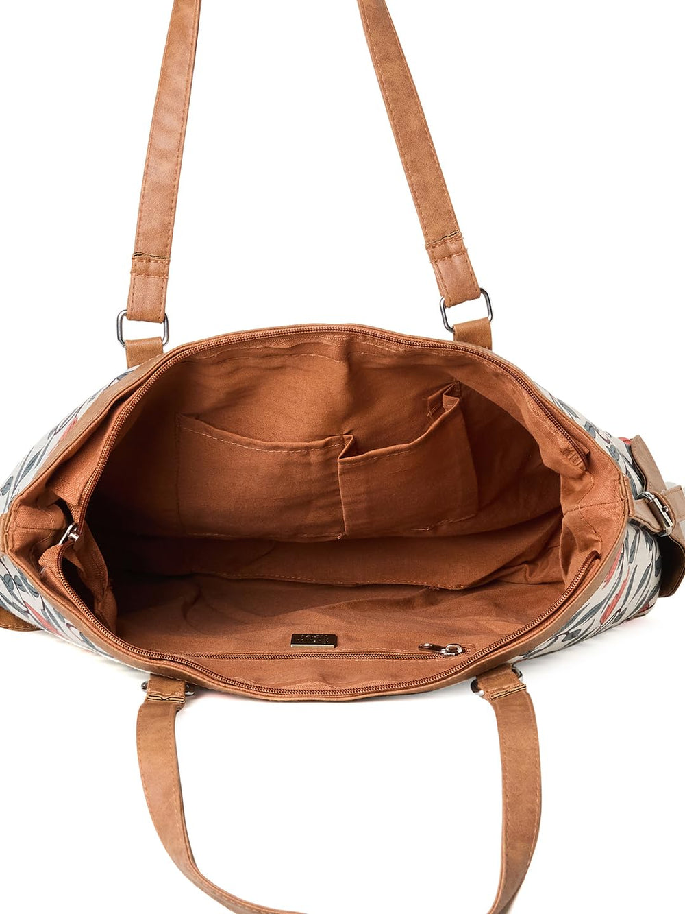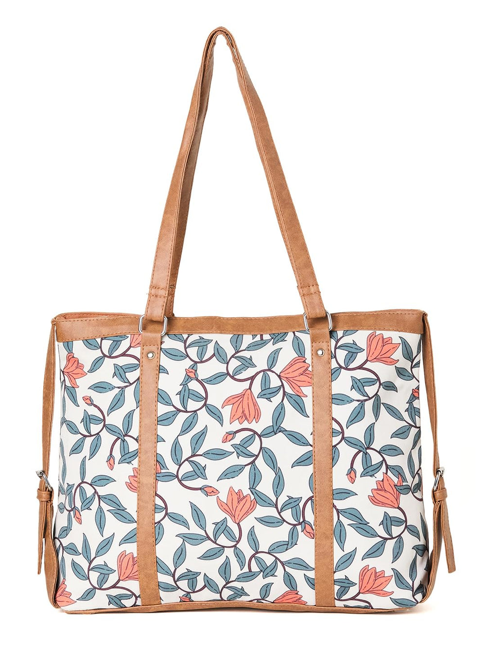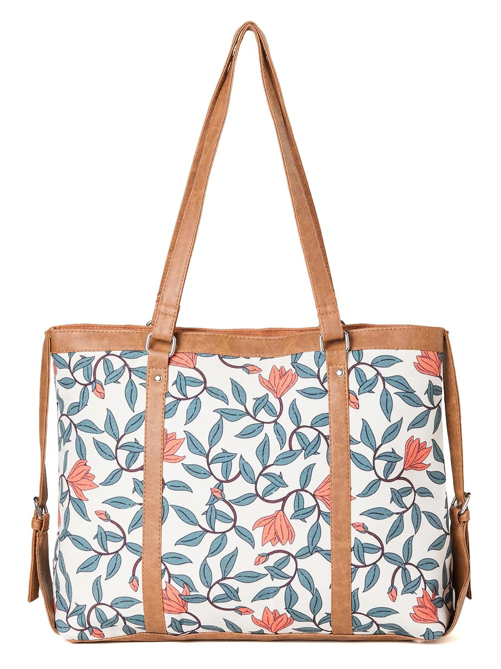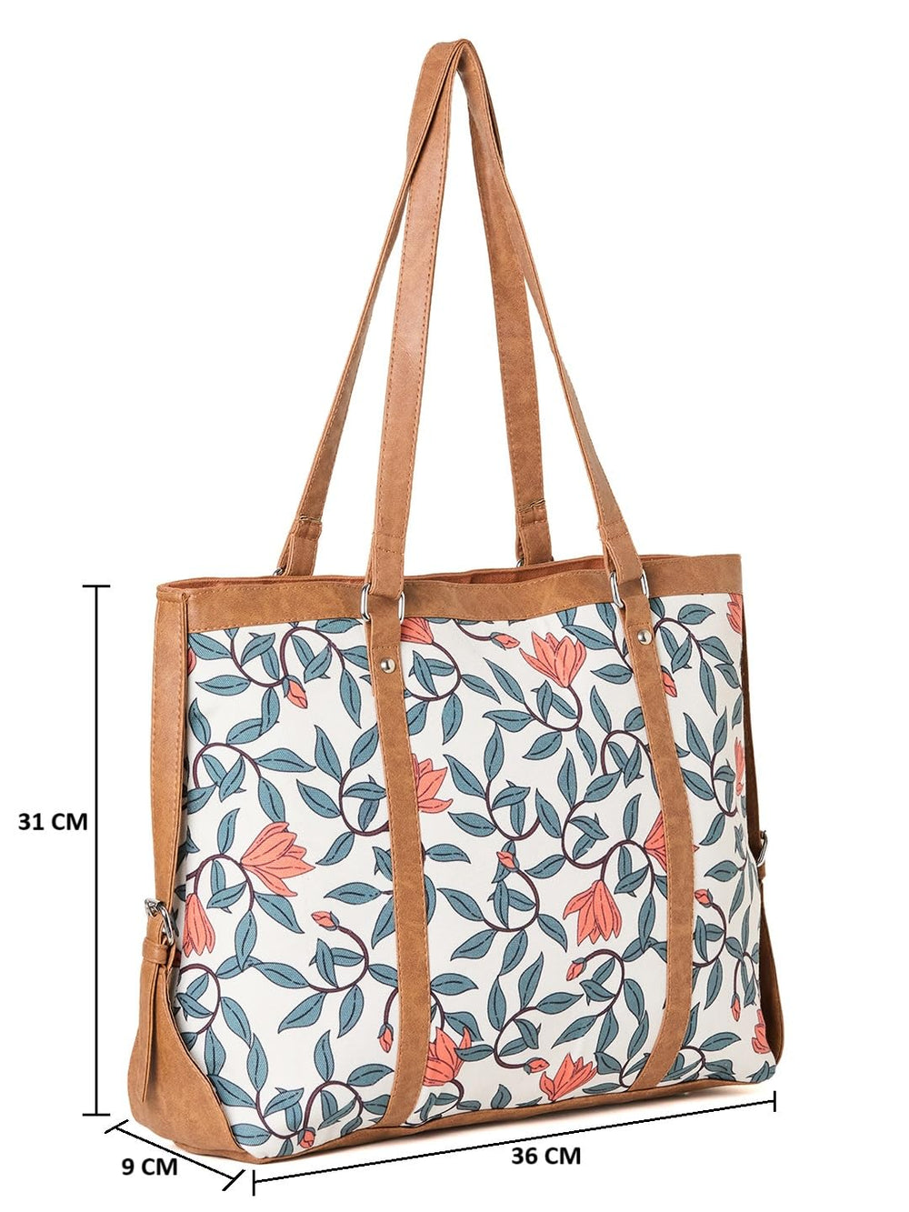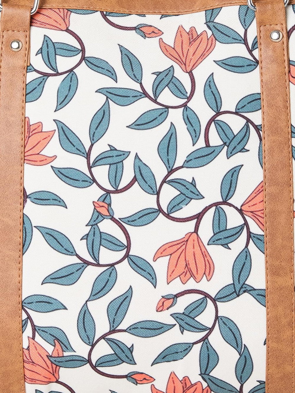 This stylish tote bag combines functionality with elegance. The canvas exterior features a beautiful floral pattern in shades of coral and teal against an ivory background. The spacious interior offers ample room for carrying your essentials, while the sturdy tan leather handles provide a comfortable grip. With its timeless design and versatile size, this bag is perfect for everyday use or as a fashionable accessory. Crafted with attention to detail, it promises long-lasting quality and a touch of sophistication to your ensemble.