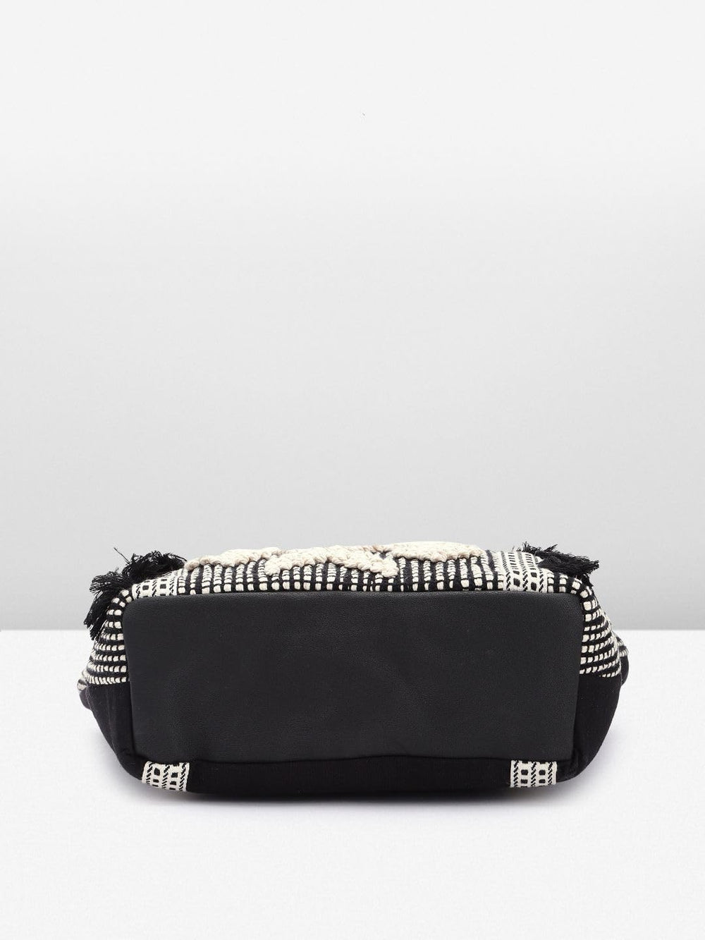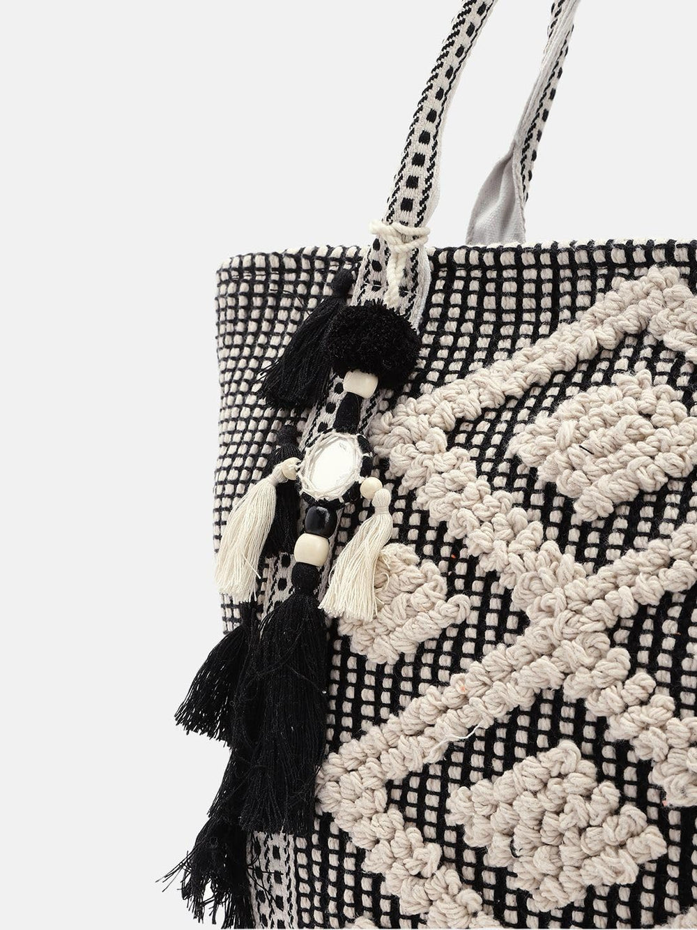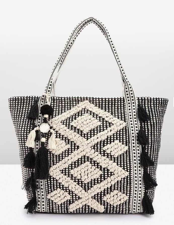 This stunning hand-woven tote bag exudes bohemian chic with its intricate diamond pattern in contrasting black and cream hues. Crafted from high-quality materials, it features a spacious interior perfect for carrying your daily essentials. The woven design is not just visually striking but also durable and long-lasting. Elevate your style with this eye-catching accessory that seamlessly blends fashion and functionality. Adorned with playful tassels, it adds a touch of whimsy to any ensemble. Whether you're running errands or enjoying a day out, this tote bag is sure to garner admiring glances. Embrace the artisanal beauty and make a statement with this versatile and chic accessory.