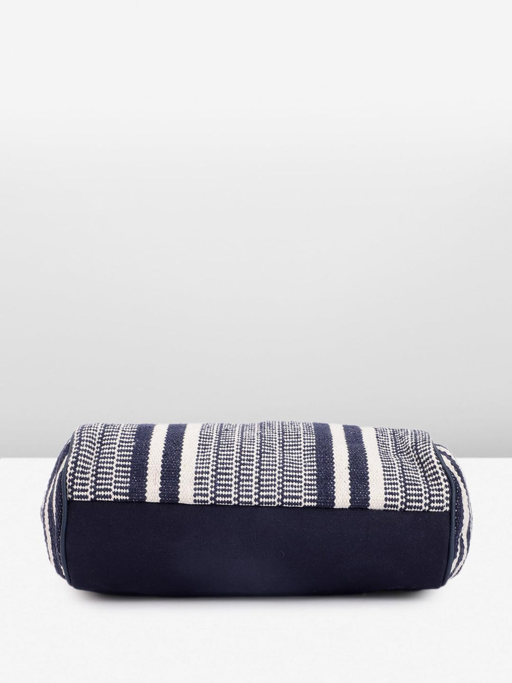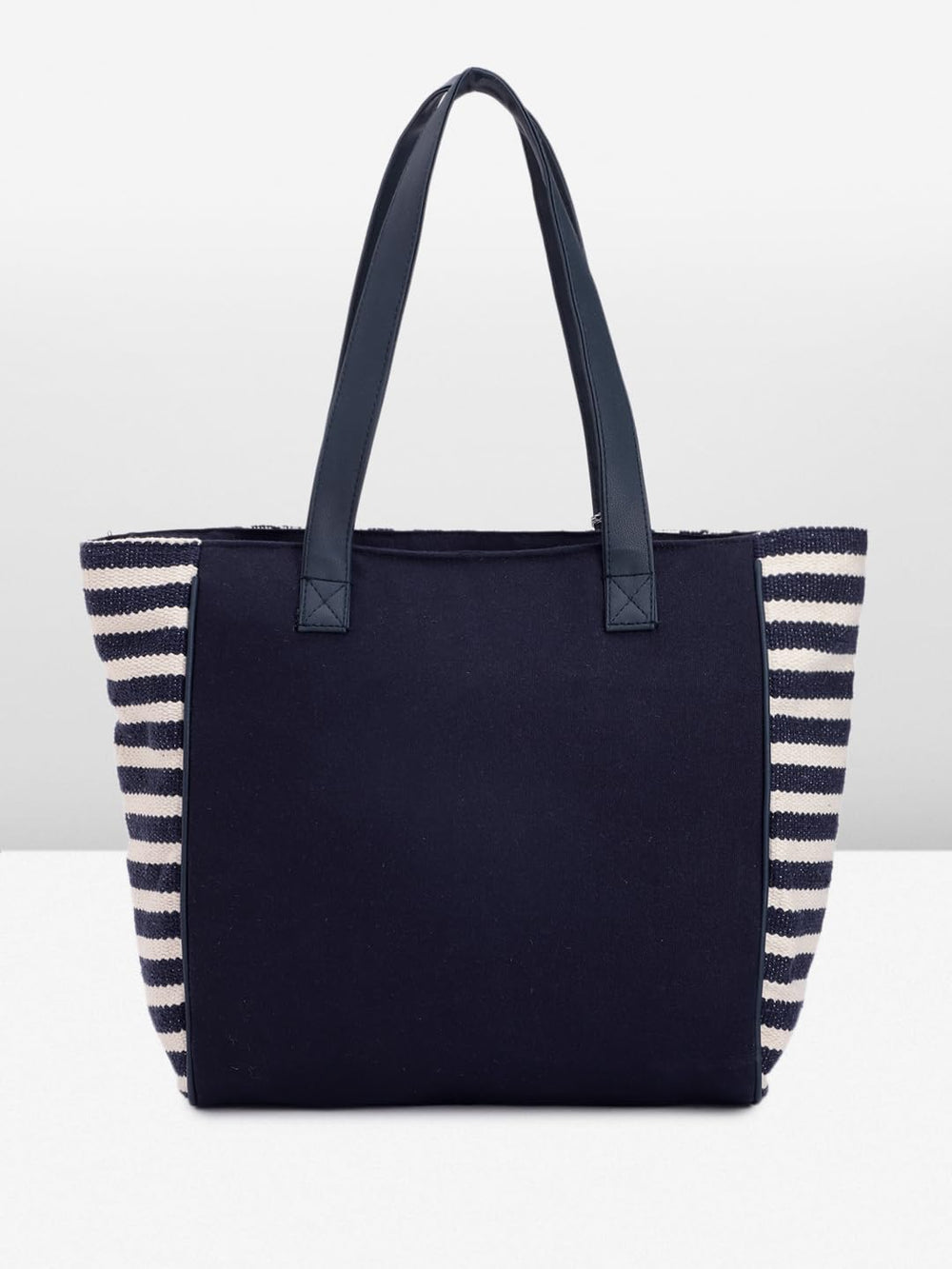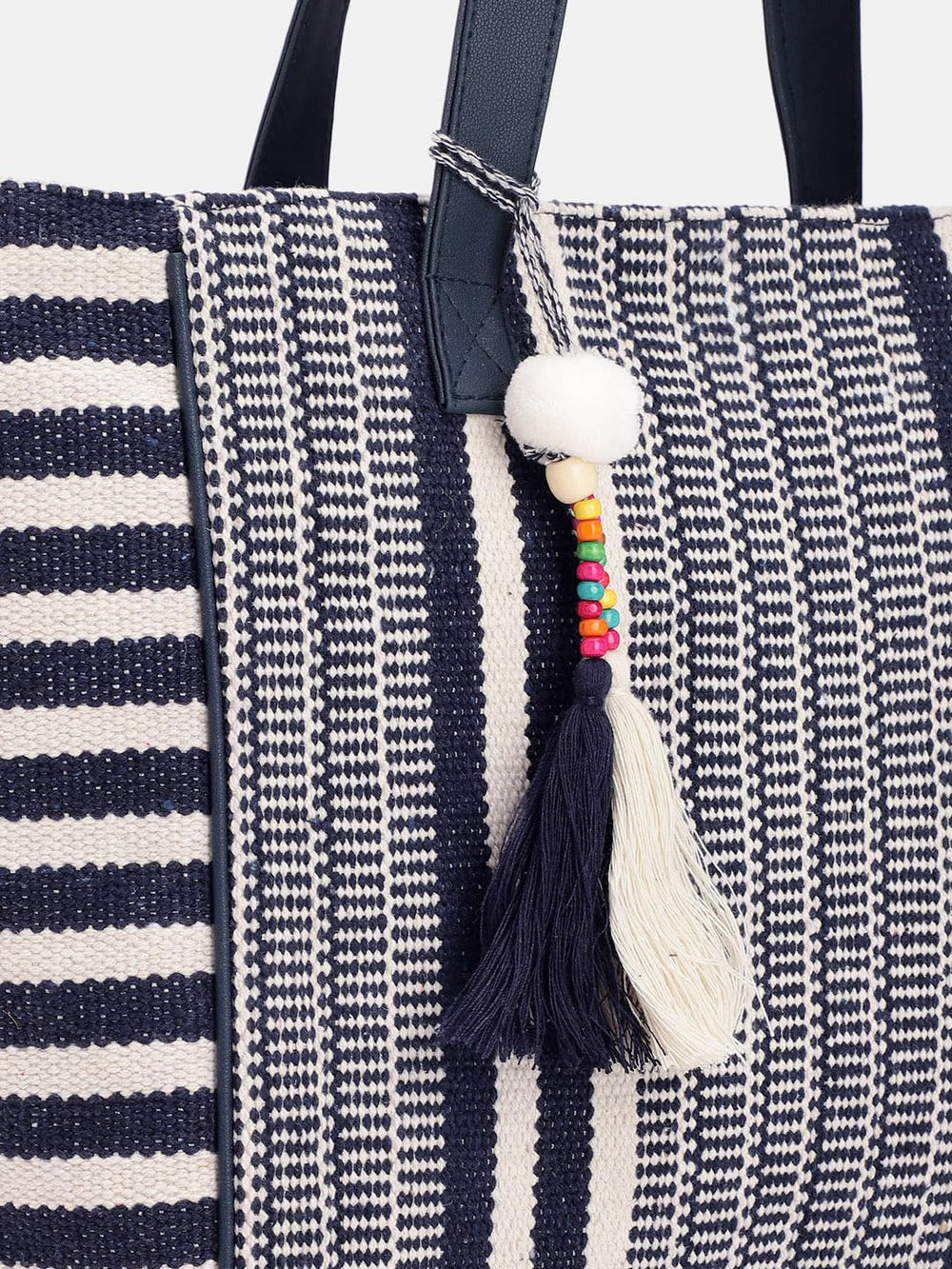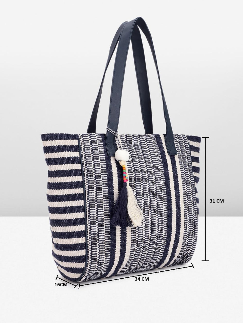 This stylish and versatile tote bag is a perfect blend of fashion and functionality. Crafted with intricate woven patterns in contrasting shades of navy and cream, it features bold stripes that add a touch of sophistication. The spacious interior allows you to carry your daily essentials with ease, while the sturdy leather handles ensure a comfortable grip. Adorned with a playful tassel charm, this bag effortlessly elevates any outfit, making it an ideal companion for work, travel, or casual outings. Embrace the timeless elegance and practicality of this meticulously designed tote bag.