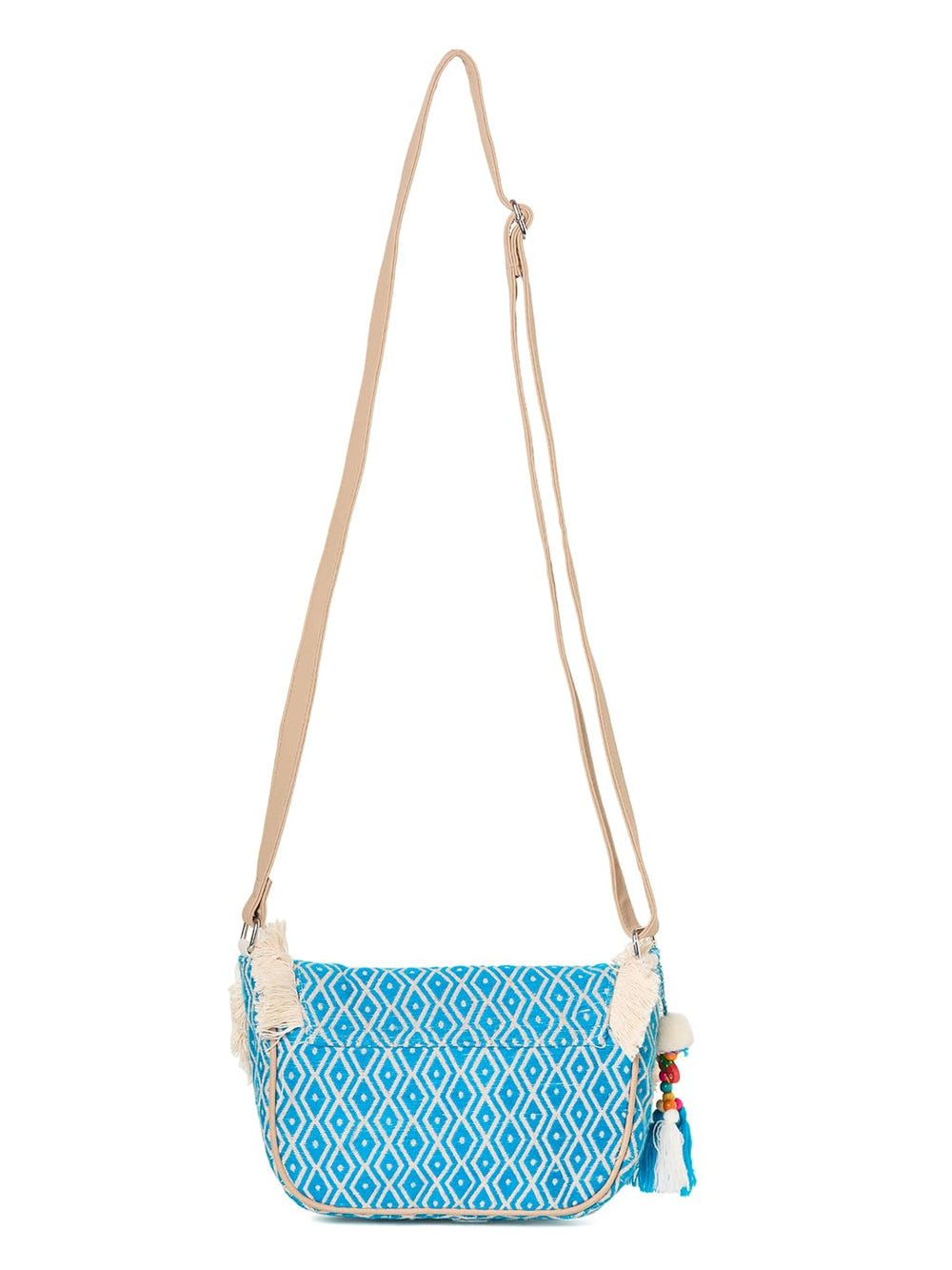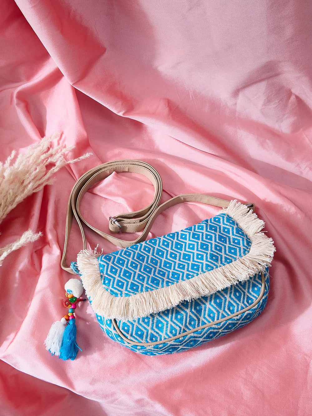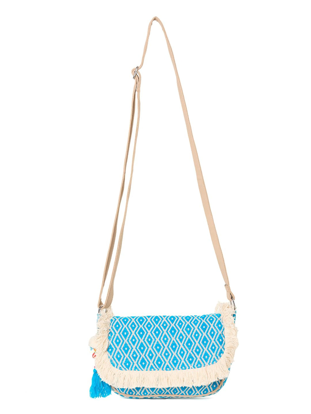 Elevate your style with this chic and trendy hand bag. Crafted with a vibrant blue and white ikat pattern, this cross-body bag exudes a bohemian flair. The woven cotton fabric features intricate diamond motifs, lending an artisanal touch. Adorned with fringed tassels and a long, adjustable strap, this bag offers both fashion and functionality. With its roomy interior, it can comfortably accommodate your daily essentials. Whether you're running errands or exploring a new city, this stylish bag is the perfect companion. Lightweight and easy to carry, it's an ideal accessory for the fashionista on-the-go. Embrace the boho-chic vibe and add a touch of global charm to your ensemble.