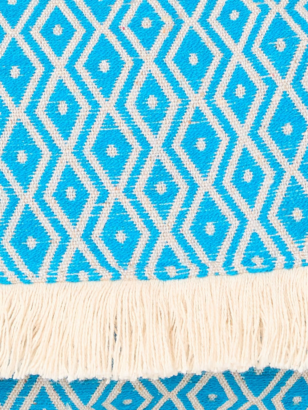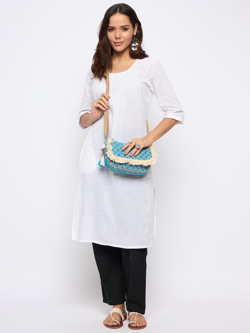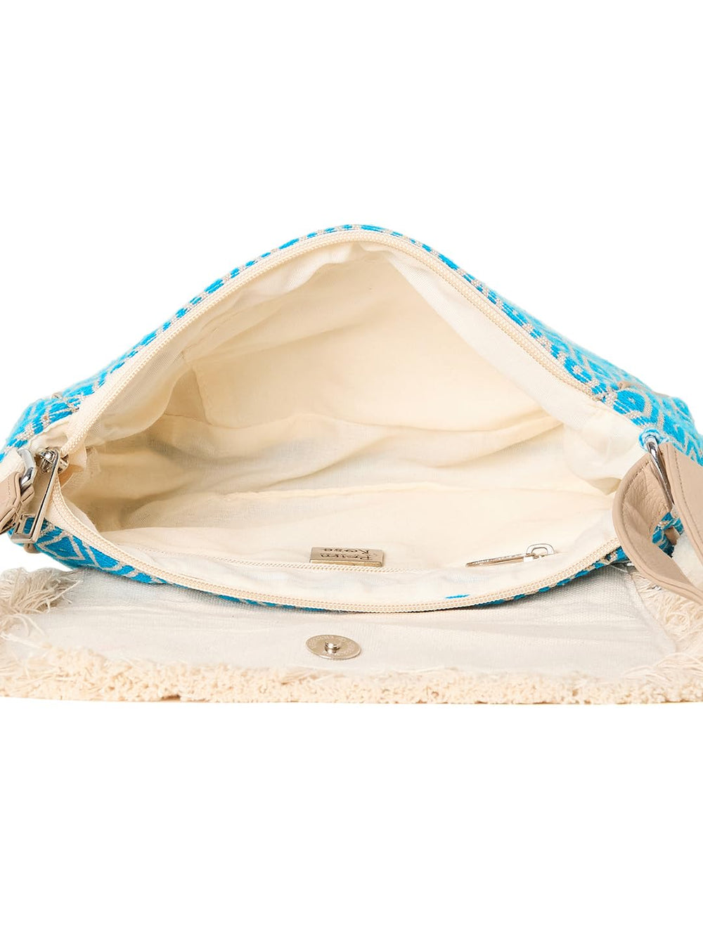 Elevate your style with this chic and trendy hand bag. Crafted with a vibrant blue and white ikat pattern, this cross-body bag exudes a bohemian flair. The woven cotton fabric features intricate diamond motifs, lending an artisanal touch. Adorned with fringed tassels and a long, adjustable strap, this bag offers both fashion and functionality. With its roomy interior, it can comfortably accommodate your daily essentials. Whether you're running errands or exploring a new city, this stylish bag is the perfect companion. Lightweight and easy to carry, it's an ideal accessory for the fashionista on-the-go. Embrace the boho-chic vibe and add a touch of global charm to your ensemble.