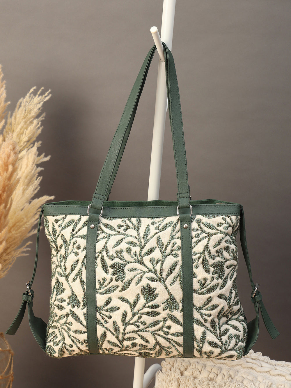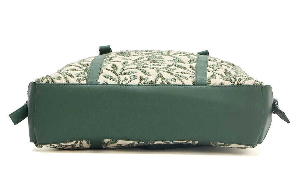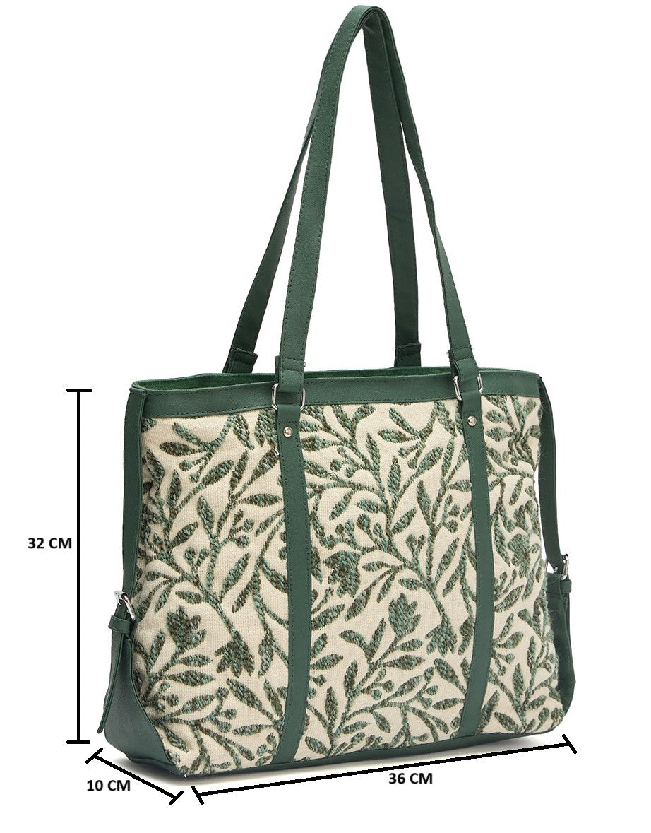 • DESIGN: Elegant canvas tote bag featuring a striking green leaf pattern on cream background with forest green trim and accents
