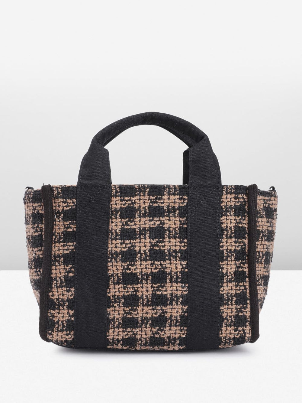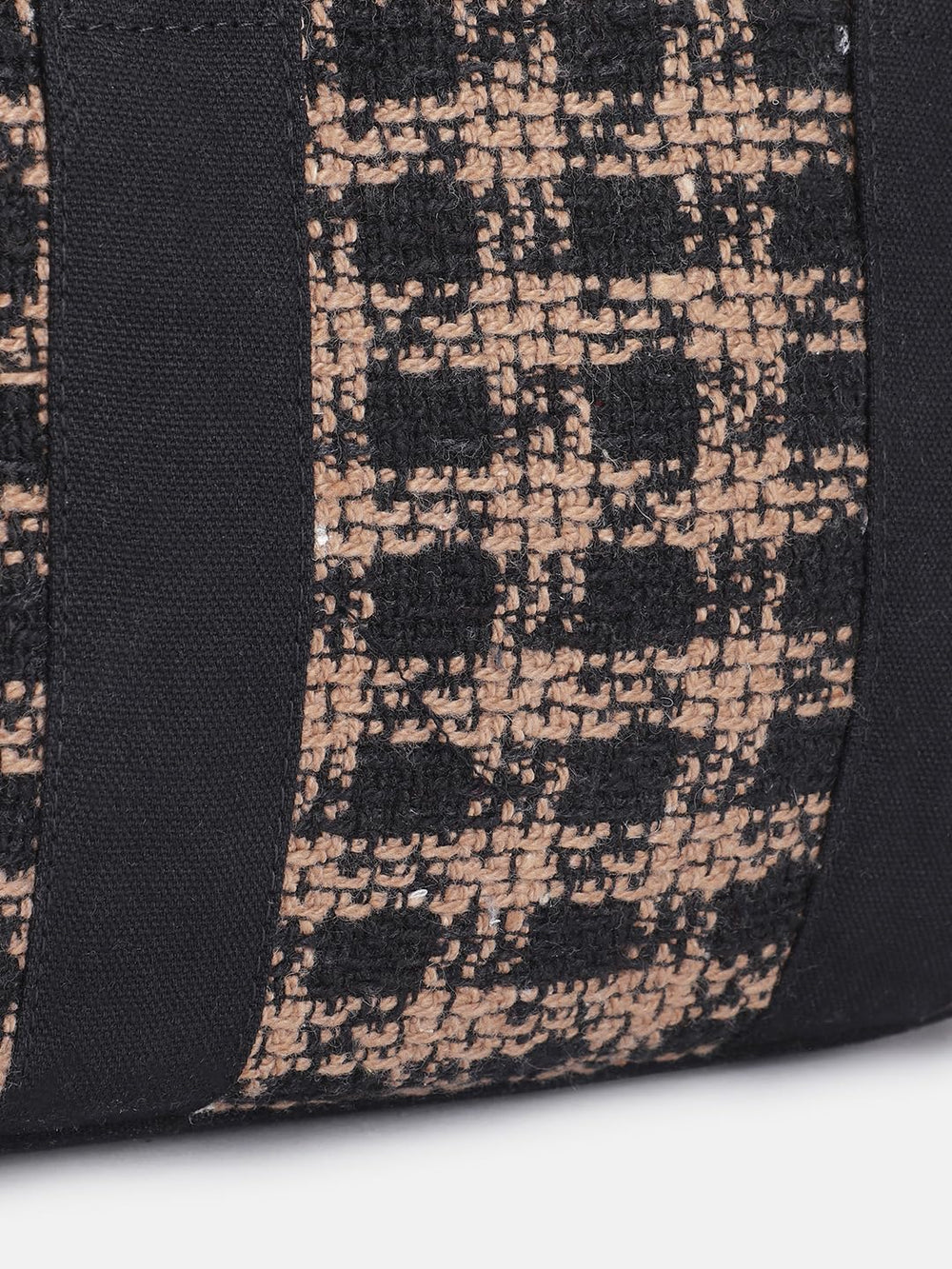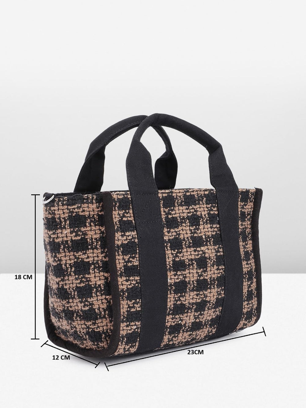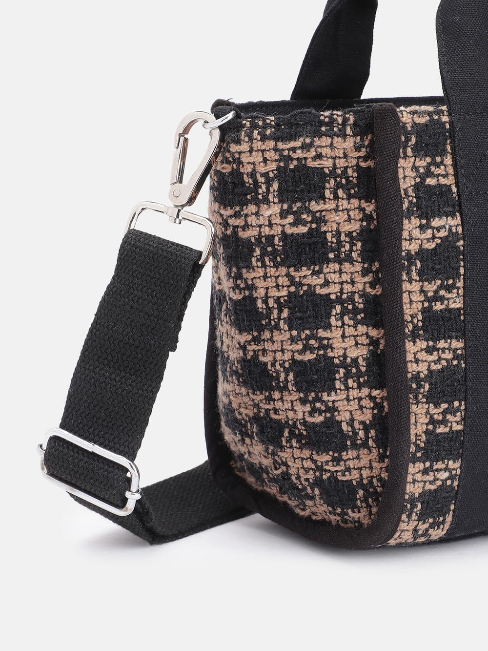 This stylish and versatile handbag is a must-have accessory for the modern woman. Crafted with a unique blend of black and beige woven fabric, it exudes a chic and sophisticated vibe. The spacious interior provides ample room for all your essentials, while the adjustable strap offers comfortable carrying options. Whether you're heading to the office or enjoying a night out, this handbag will elevate your look with its trendy design and practical functionality. Embrace effortless style and convenience with this fashionable companion.