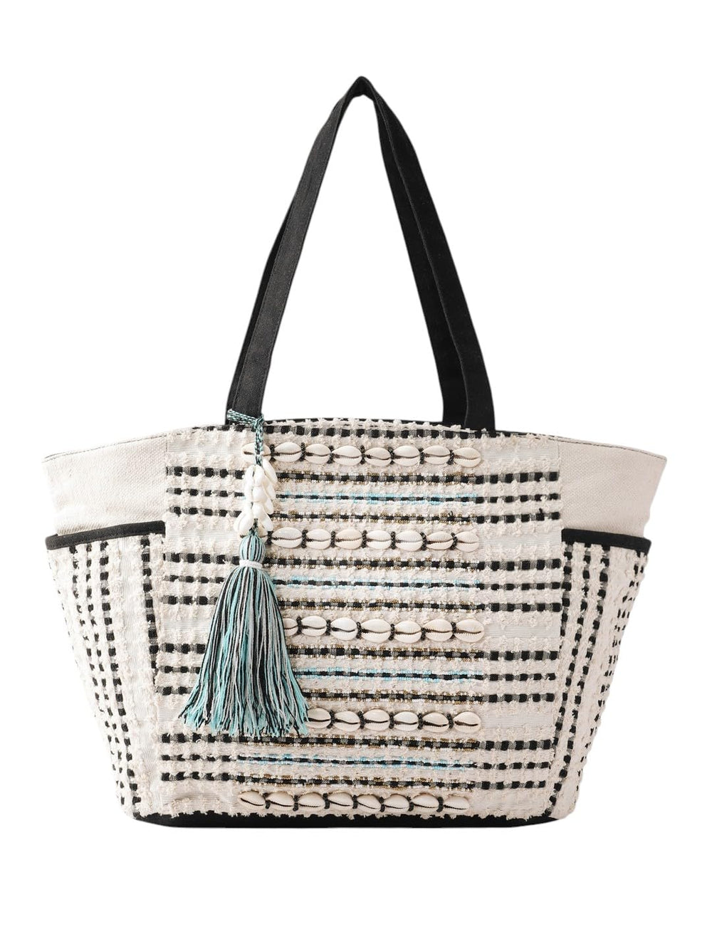 Make a stylish statement with this beautifully crafted woven beach tote bag. The striking black and white striped pattern creates a sophisticated geometric design, while the shell embellishments add a charming coastal touch. The bag features a spacious interior perfect for carrying beach essentials, shopping items, or daily necessities. A luxurious turquoise tassel accent provides an eye-catching pop of colour and bohemian flair. Constructed with durable materials and comfortable black shoulder straps, this versatile tote combines practicality with fashion-forward design. The roomy silhouette and sturdy construction make it ideal for beach outings, weekend getaways, or casual everyday use. The neutral colour palette ensures it pairs effortlessly with any outfit, while the unique woven texture adds distinctive character. This tote bag seamlessly blends resort-style charm with practical functionality, making it a must-have accessory for the fashion-conscious shopper.