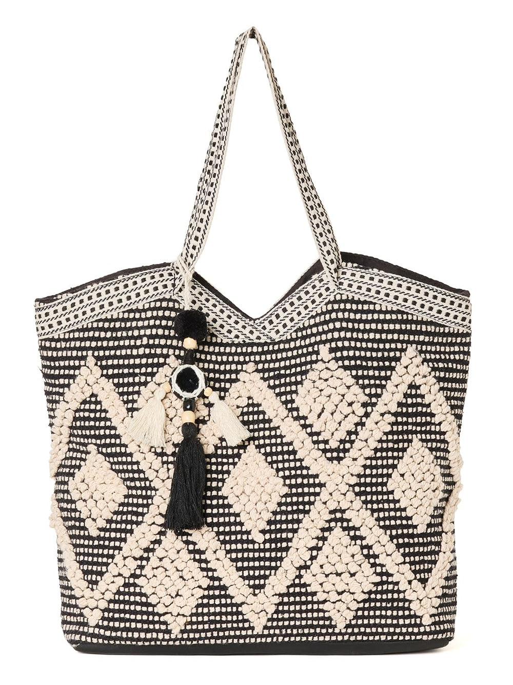 This exquisite handcrafted tote bag is a true masterpiece of artisanal craftsmanship. Meticulously woven with intricate patterns of black and beige, it exudes an air of sophistication and elegance. The spacious interior provides ample room for all your essentials, while the sturdy handles ensure comfortable carrying. Adorned with tassels that add a touch of whimsy, this bag is both functional and fashionable. Crafted with meticulous attention to detail, it is a versatile accessory that seamlessly transitions from day to night. Elevate your style with this stunning piece that effortlessly blends tradition and modernity.