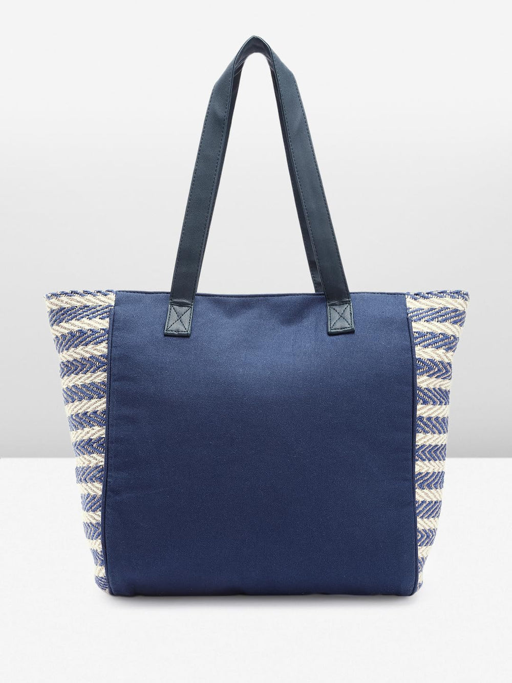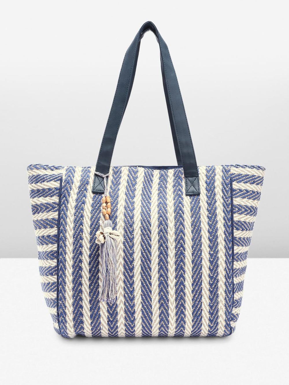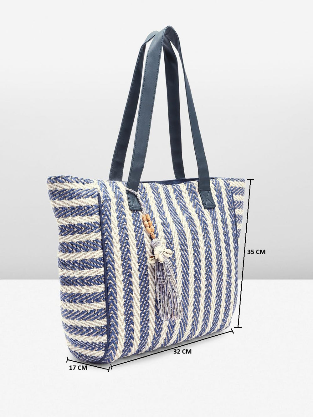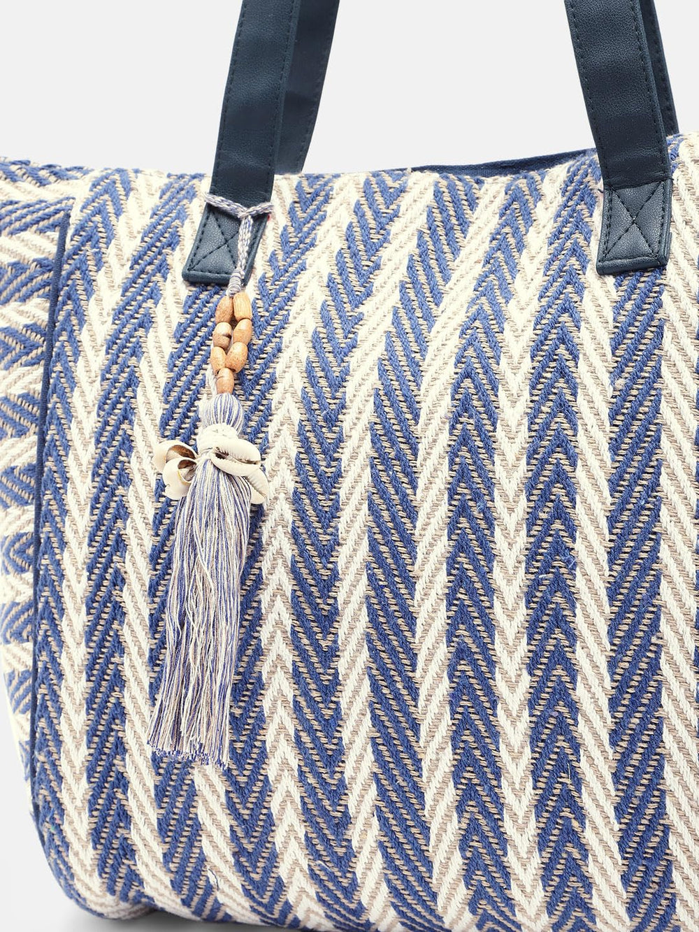 This stylish tote bag is a versatile accessory that effortlessly combines fashion and functionality. Crafted with a striking chevron pattern in shades of navy and cream, it exudes a bohemian charm that adds a touch of sophistication to any outfit. The spacious interior provides ample room for your daily essentials, while the sturdy leather handles ensure a comfortable carrying experience. Adorned with playful tassels, this bag is a true statement piece that will elevate your style quotient. Meticulously handcrafted, it showcases the artistry of skilled artisans, making it a unique and cherished possession. Embrace the essence of timeless elegance with this captivating tote bag.