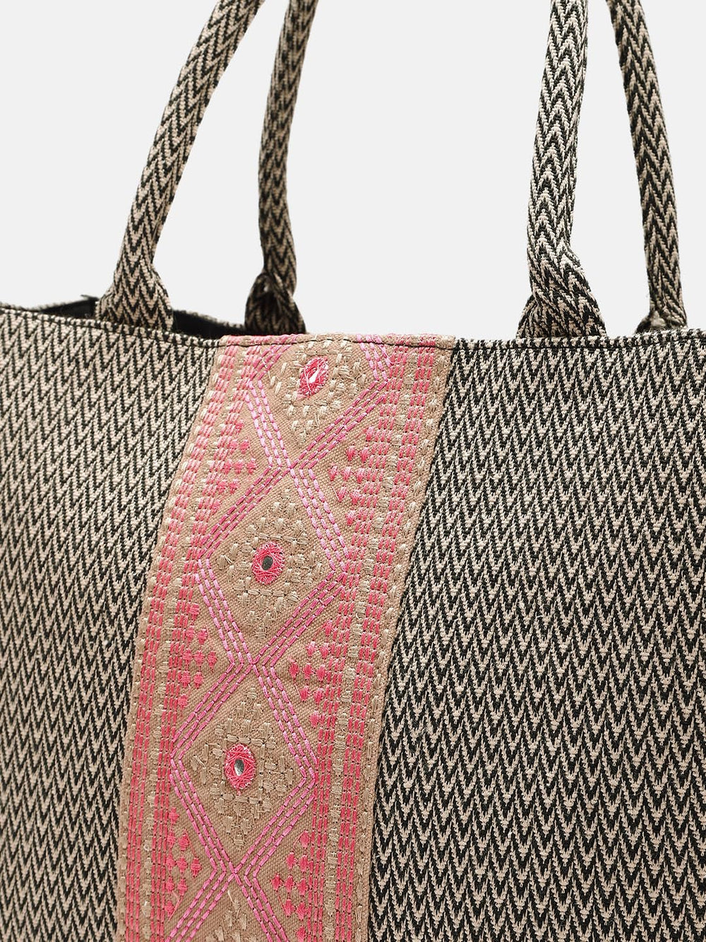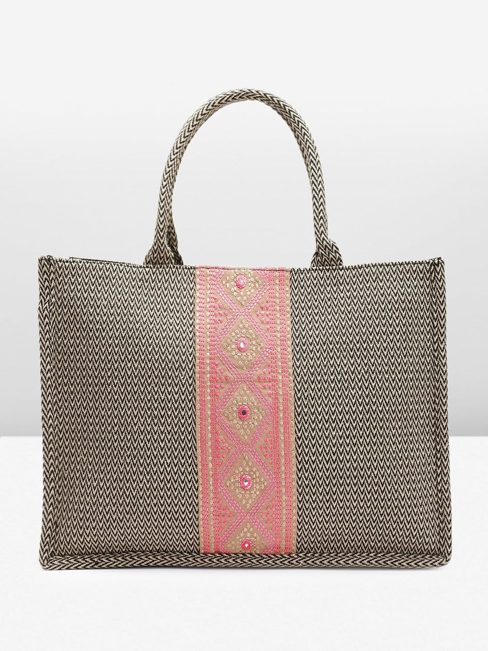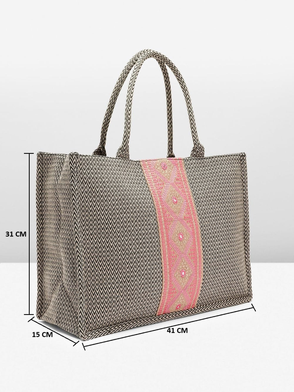 Experience the timeless charm of this handcrafted tote bag, a perfect blend of style and functionality. Meticulously woven with intricate zig-zag patterns in earthy tones, it showcases the artistry of skilled artisans. The striking contrast of the vibrant pink panel adorned with delicate floral motifs adds a touch of elegance. Spacious and durable, this bag effortlessly accommodates your daily essentials, making it an ideal companion for work, travel, or leisure. Embrace the beauty of traditional craftsmanship with this exquisite tote bag, a true testament to the rich cultural heritage it represents. Measurements: 45 cm x 30 cm x 15 cm.