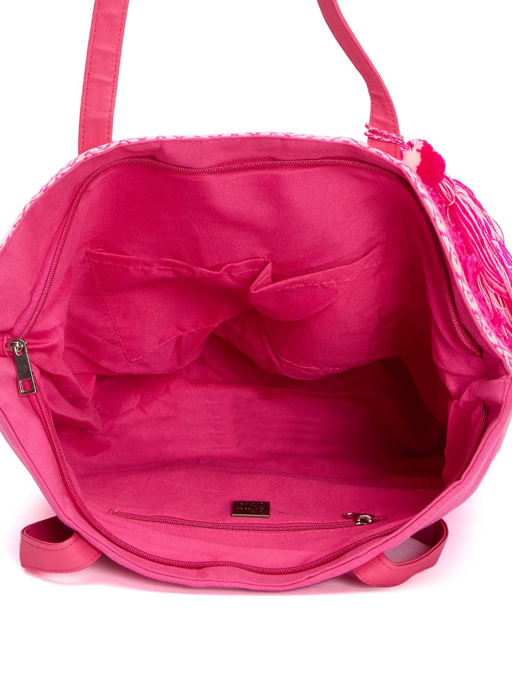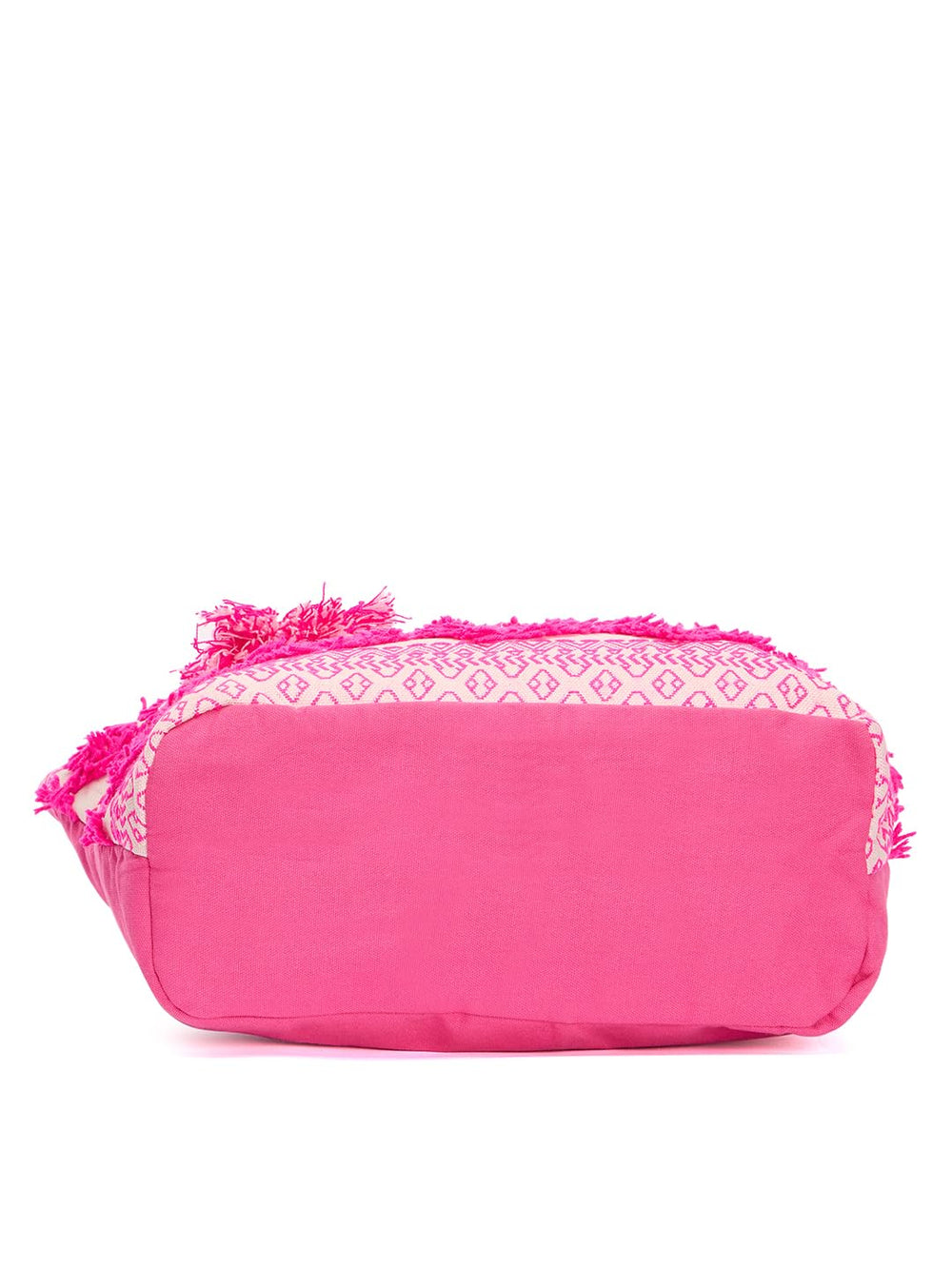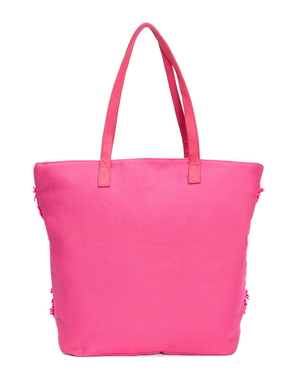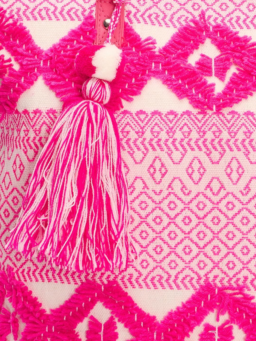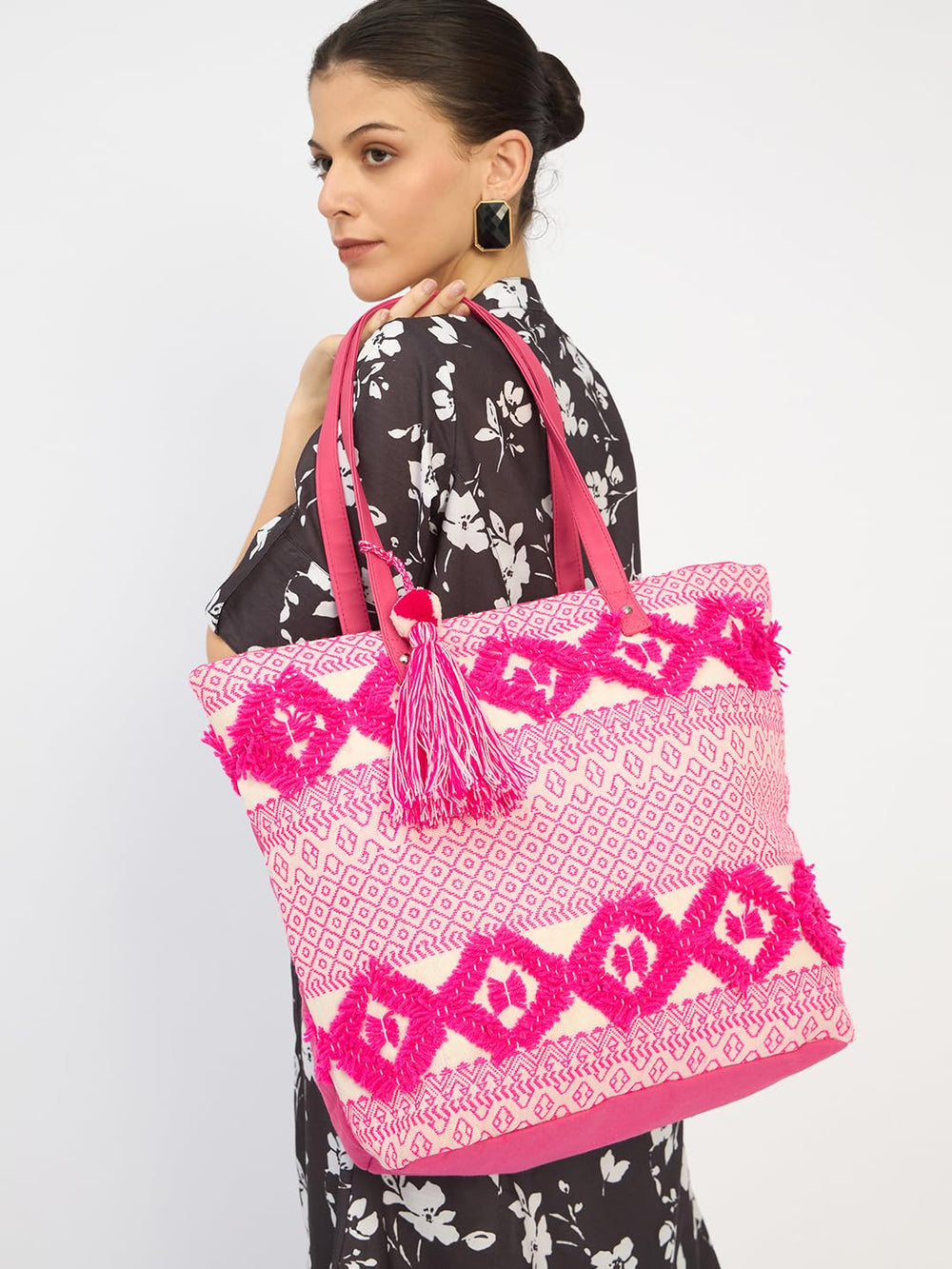 Make a bold fashion statement with this eye-catching bohemian beach tote bag featuring a stunning pink and white geometric pattern. The bag showcases beautiful textural elements with its vibrant pink fringe detailing arranged in an artistic zigzag pattern across the body. A charming tassel accent adds a playful touch to this stylish accessory. Crafted with durable canvas material, this spacious tote is perfect for carrying your essentials to the beach, market, or casual outings. The comfortable shoulder straps ensure easy carrying, while the roomy interior provides ample space for your belongings. The elegant combination of pink and white creates a fresh, feminine look that complements various outfits. This versatile tote seamlessly blends traditional geometric patterns with modern design elements, making it an ideal accessory for both everyday use and special occasions. The distinctive pattern and textural elements make this bag a standout accessory that's sure to draw admiring glances.