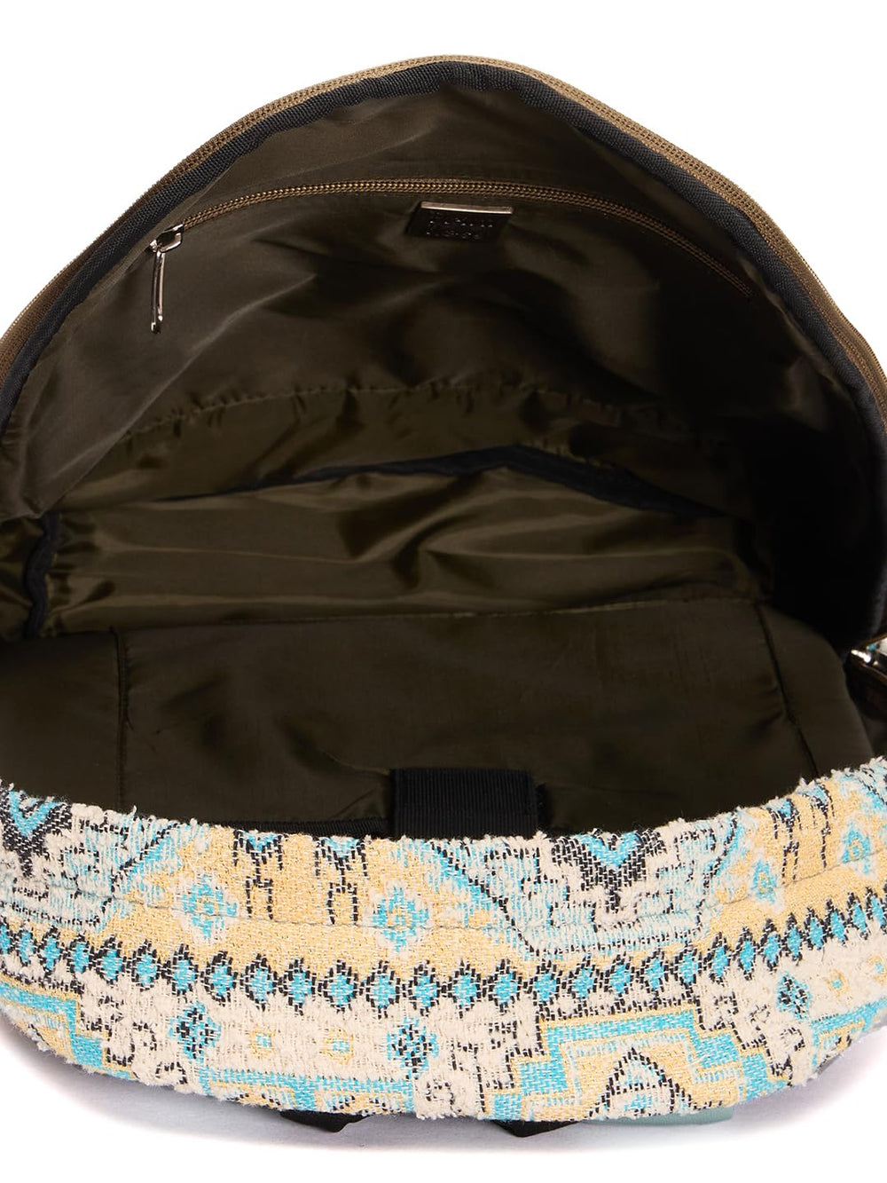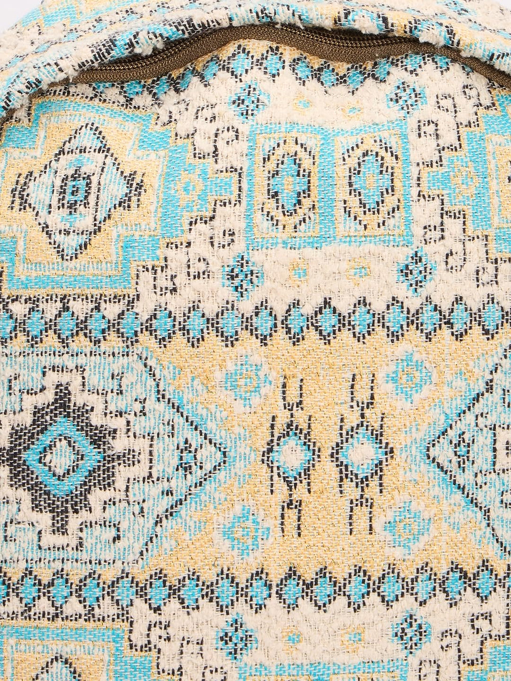 Step out in style with this charming Bohemian canvas backpack featuring a mesmerizing Aztec-inspired pattern. The elegant design showcases intricate geometric motifs in soothing blue and beige hues, perfectly complemented by a sophisticated grey base. This backpack combines aesthetic appeal with practical functionality, featuring durable canvas construction and convenient zipper closures. The spacious main compartment offers ample storage for your daily essentials, while the sturdy black straps ensure comfortable carrying. The unique pattern makes each backpack a statement piece, perfect for university students, travelers, or anyone seeking to add a touch of bohemian flair to their everyday carry. The contrasting grey base not only adds visual interest but also provides enhanced durability where it matters most. Whether you're heading to classes, planning a weekend getaway, or simply running daily errands, this versatile backpack delivers both style and substance.