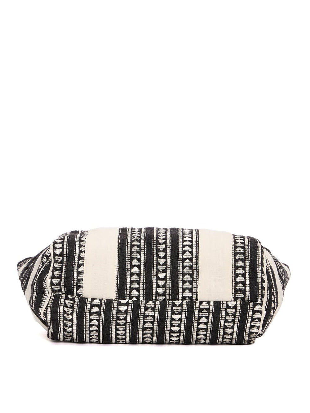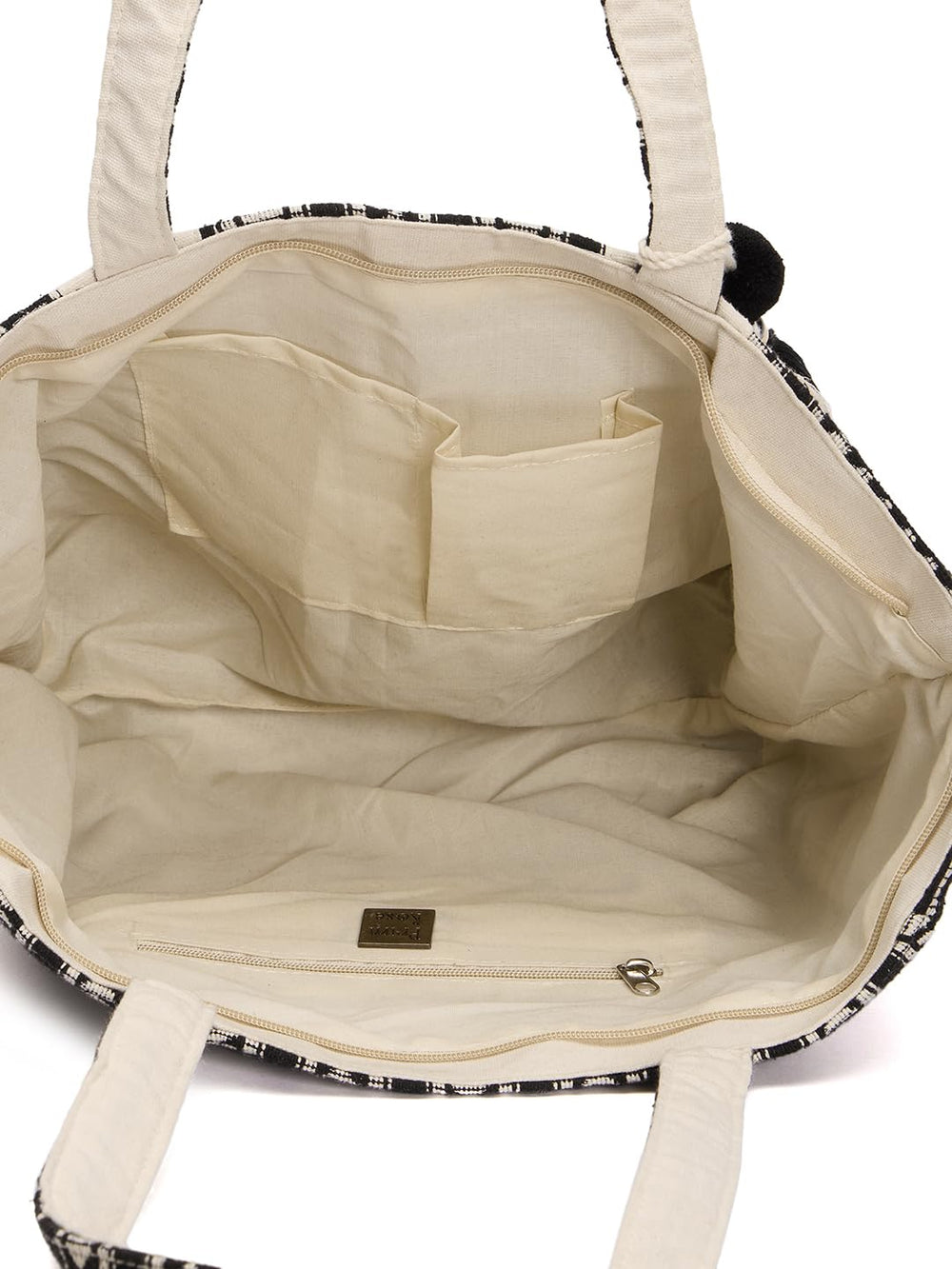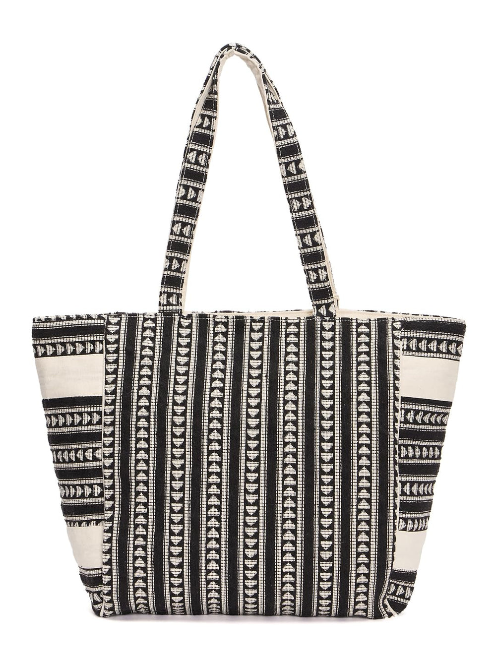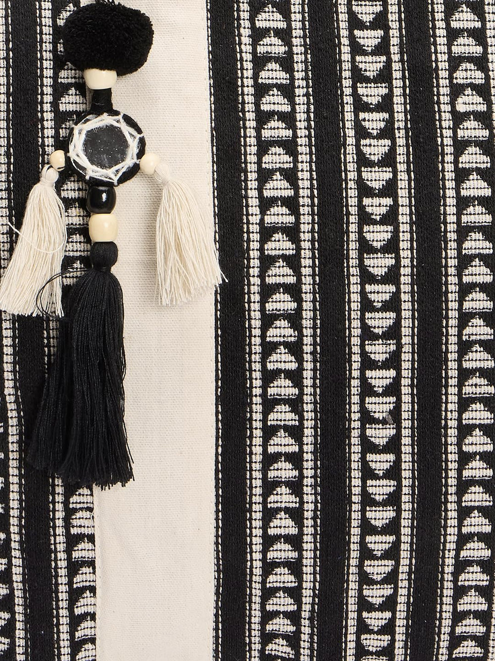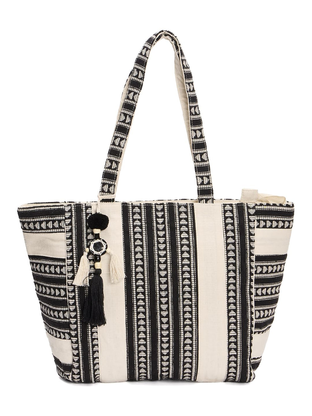 Make a bold style statement with this striking black and white geometric pattern tote bag. The sophisticated design features elegant tribal-inspired stripes that blend contemporary aesthetics with bohemian charm. Crafted from durable canvas material, this spacious shoulder bag is perfect for everyday use, shopping trips, or beach outings. The bag is adorned with decorative black and white tassels that add a playful touch to its sophisticated appearance. The comfortable shoulder straps ensure easy carrying, while the roomy interior provides ample space for all your essentials. The contrasting monochromatic pattern makes it a versatile accessory that complements any outfit. This tote combines fashion with functionality, making it an ideal choice for the style-conscious individual who needs a reliable, spacious bag for daily use. The classic colour combination and geometric patterns create a timeless appeal that will never go out of style.