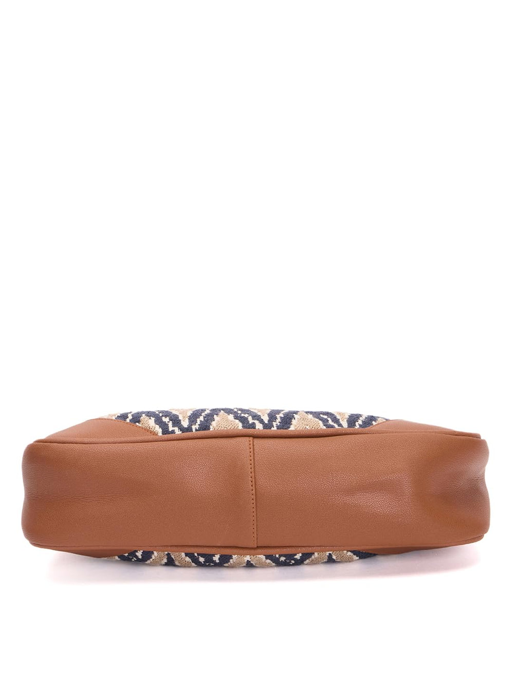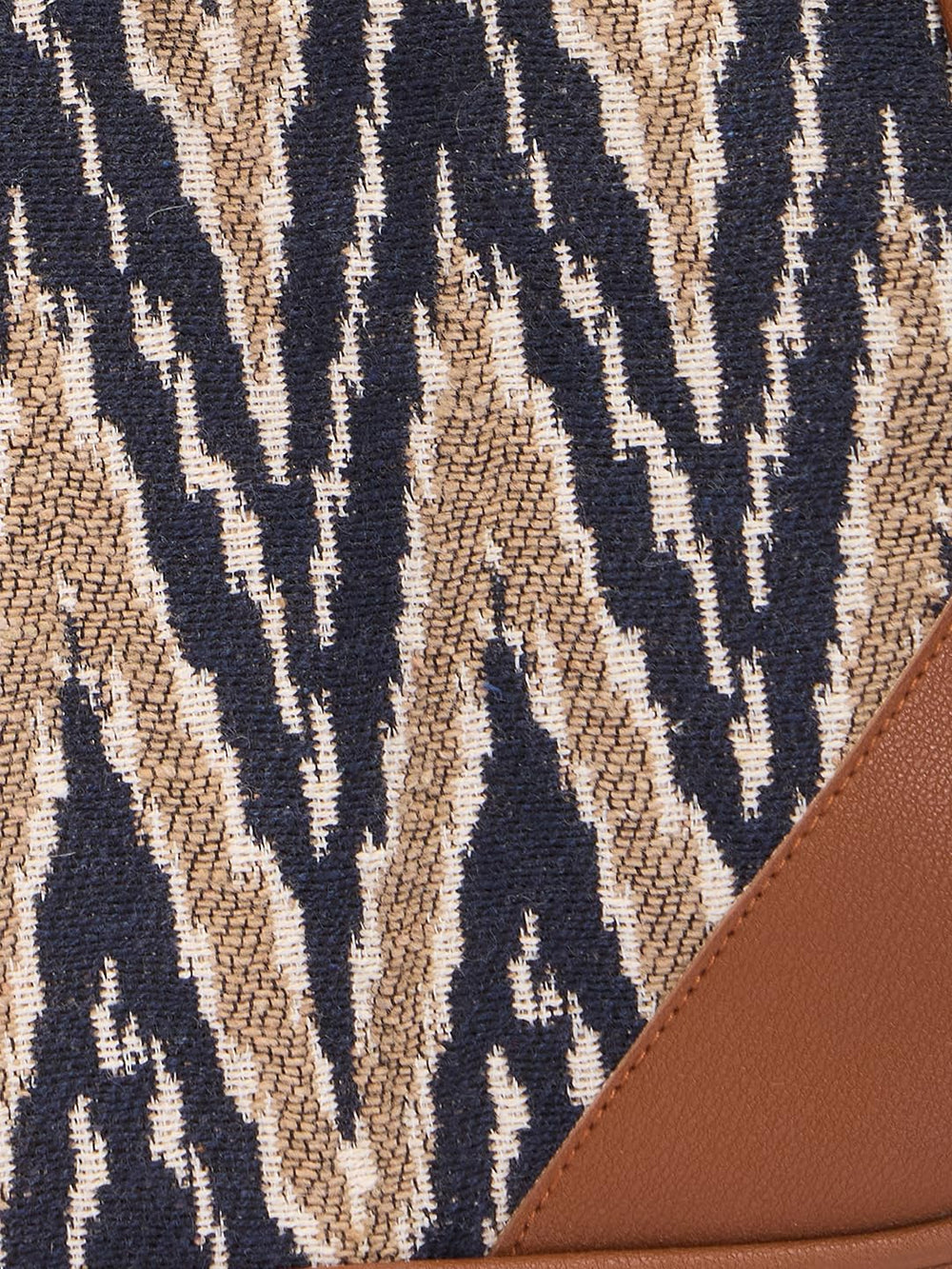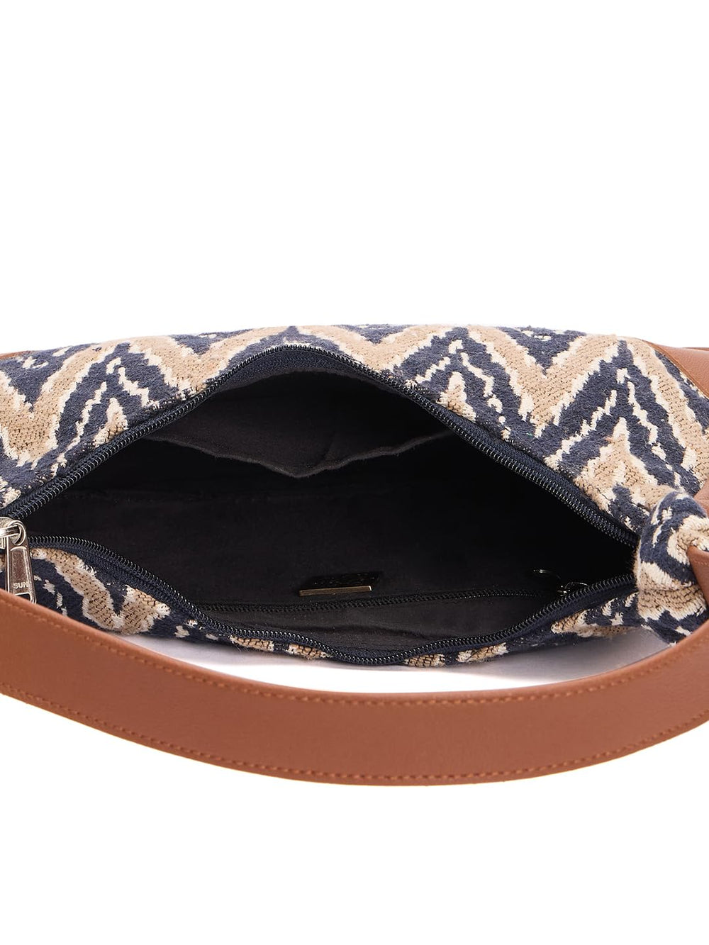Make a stylish statement with this sophisticated hobo handbag featuring an eye-catching chevron pattern. The striking combination of navy and beige canvas creates a timeless geometric design that adds visual interest to any outfit. The bag is beautifully accented with rich brown leather trim and matching shoulder strap, offering both elegance and durability. The curved silhouette of this hobo style provides ample space for your daily essentials while maintaining a sleek profile. The knotted strap details add a touch of artisanal charm to the overall design. Perfect for both casual outings and semi-formal occasions, this versatile handbag combines classic aesthetics with practical functionality. The textured canvas material offers durability for everyday use, while the leather trim adds sophistication and structure to the design. This handbag seamlessly blends contemporary pattern work with traditional craftsmanship, making it an ideal accessory for the fashion-conscious individual who appreciates both style and substance.