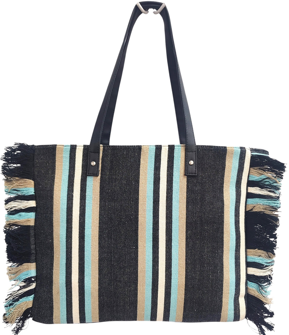 This striking striped beach tote bag combines style and functionality for your everyday adventures. Crafted from durable jacquard material, it features an eye-catching pattern of black, turquoise, and beige stripes that adds a vibrant touch to any outfit. The spacious interior provides ample room for all your beach essentials, shopping items, or daily necessities, making it perfect for trips to the shore, market runs, or casual outings. Distinctive fringe detailing along the sides creates a bohemian aesthetic that sets this bag apart from ordinary totes. The sturdy shoulder straps are designed for comfortable carrying, whether you're strolling along the boardwalk or heading to a weekend getaway. The jacquard weave ensures long-lasting durability whilst maintaining a lightweight feel. This versatile tote transitions seamlessly from beach days to city adventures, offering both practicality and fashion-forward design in one stunning accessory.