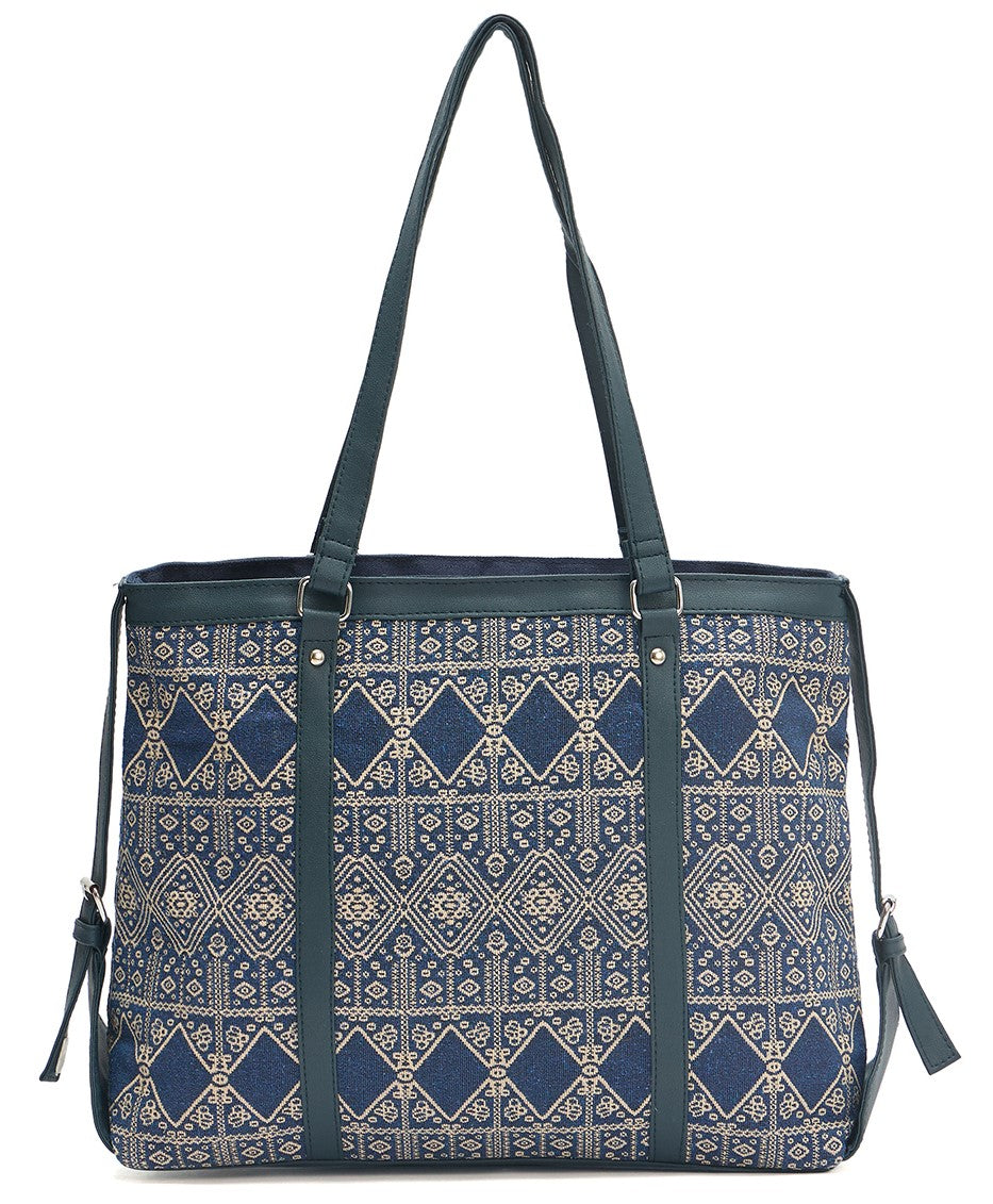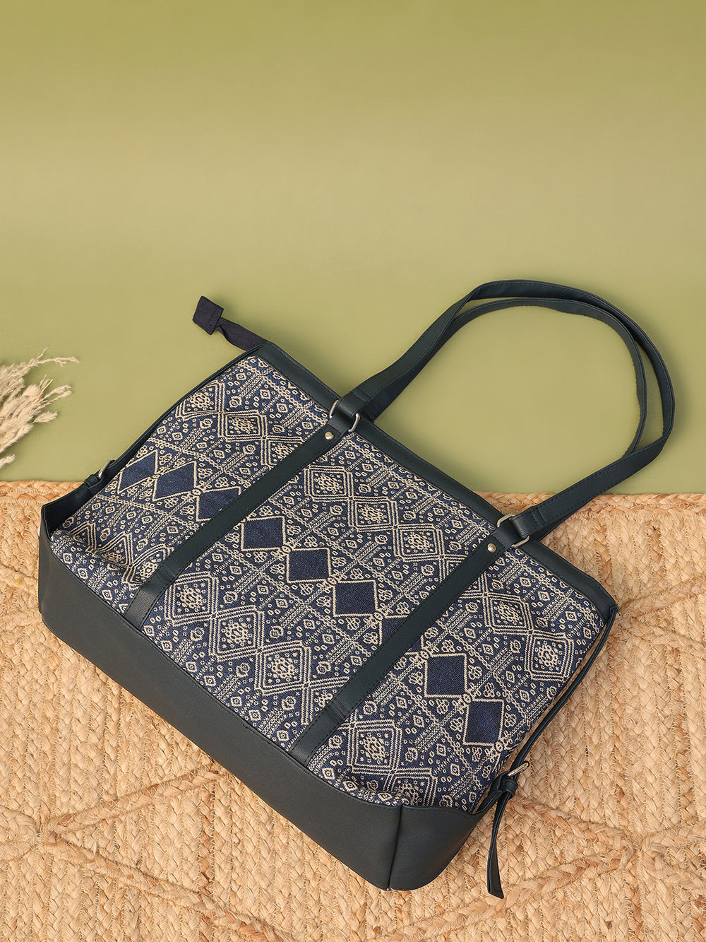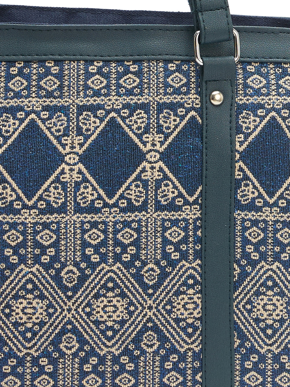 • DESIGN: Stylish ethnic print tote bag featuring a striking navy blue and beige geometric diamond pattern with intricate traditional motifs