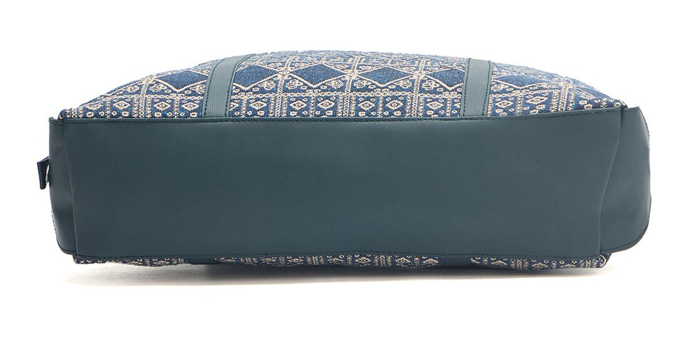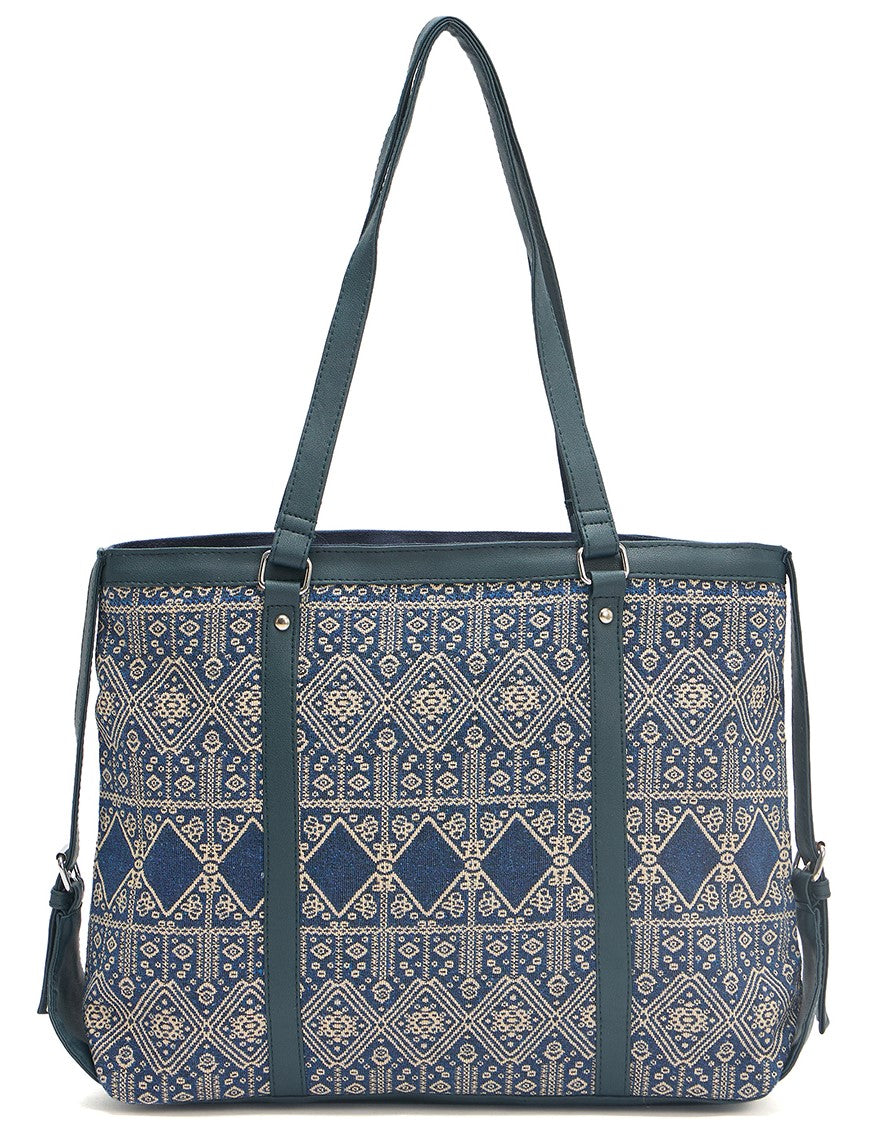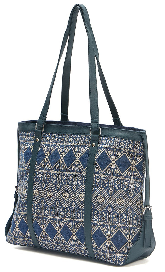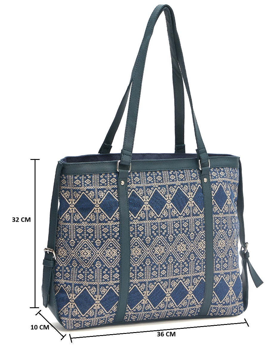 • DESIGN: Stylish ethnic print tote bag featuring a striking navy blue and beige geometric diamond pattern with intricate traditional motifs