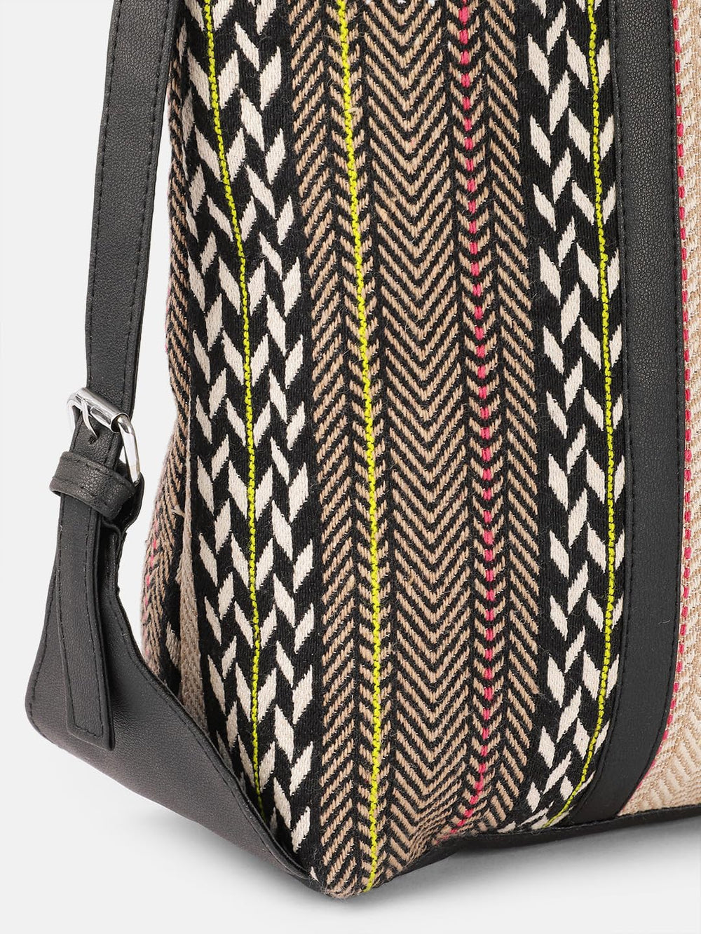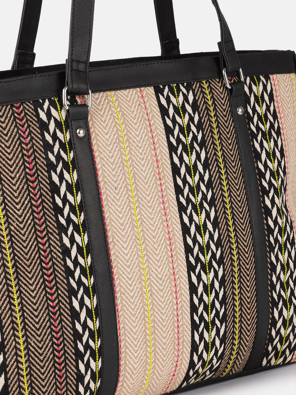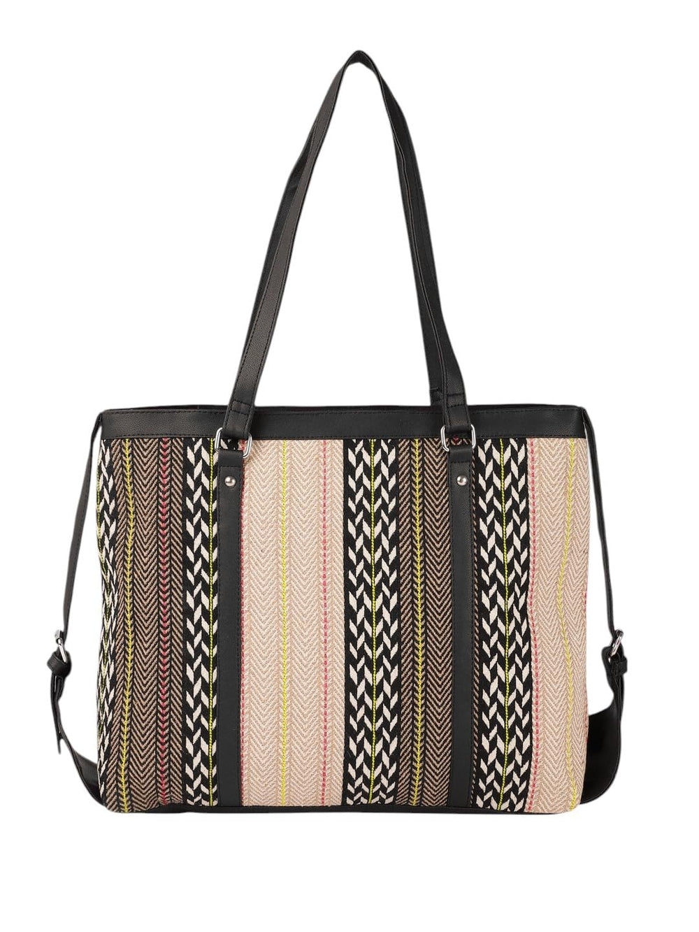 Make a bold fashion statement with this chic and versatile tote bag featuring an eye-catching chevron pattern design. The bag showcases a stunning combination of black, white, and multi-coloured stripes, creating an intricate herringbone effect that adds sophistication to any outfit. The durable black trim and handles provide both style and functionality, while the spacious interior offers ample room for your daily essentials. The thoughtfully designed structure includes sturdy metal hardware and adjustable side details for added convenience. Perfect for work, shopping, or casual outings, this tote bag seamlessly blends contemporary style with practical utility. The neutral base colour palette, accented with pops of yellow and coral stripes, ensures this bag coordinates effortlessly with various ensembles. The shoulder straps are perfectly sized for comfortable carrying, whether by hand or over the shoulder. This fashionable tote is an ideal choice for the modern woman who values both style and functionality in her accessories.