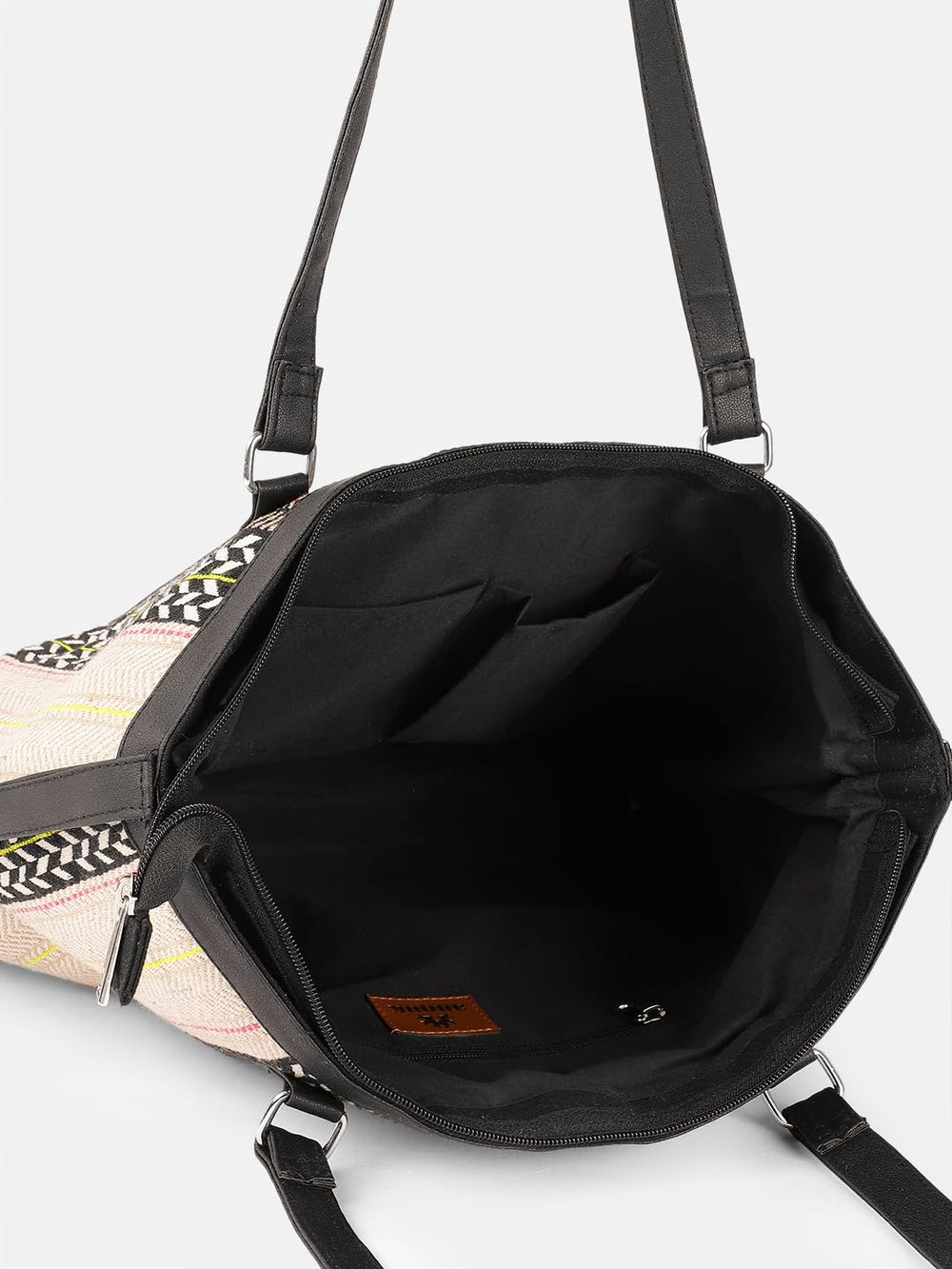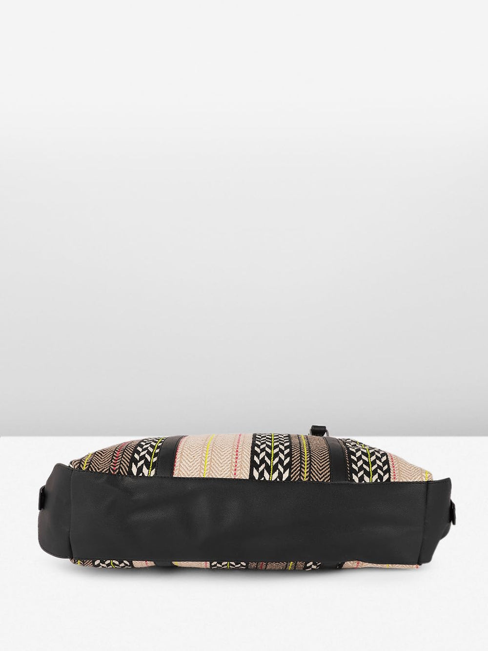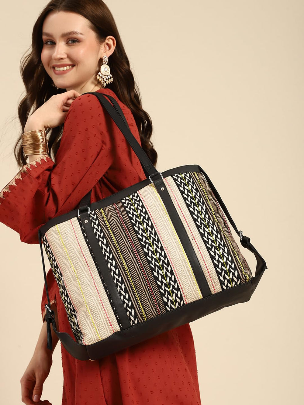 Make a bold fashion statement with this chic and versatile tote bag featuring an eye-catching chevron pattern design. The bag showcases a stunning combination of black, white, and multi-coloured stripes, creating an intricate herringbone effect that adds sophistication to any outfit. The durable black trim and handles provide both style and functionality, while the spacious interior offers ample room for your daily essentials. The thoughtfully designed structure includes sturdy metal hardware and adjustable side details for added convenience. Perfect for work, shopping, or casual outings, this tote bag seamlessly blends contemporary style with practical utility. The neutral base colour palette, accented with pops of yellow and coral stripes, ensures this bag coordinates effortlessly with various ensembles. The shoulder straps are perfectly sized for comfortable carrying, whether by hand or over the shoulder. This fashionable tote is an ideal choice for the modern woman who values both style and functionality in her accessories.